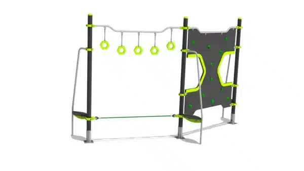 Tweevoudig klimparcours met slackline, klimwand en stangen.