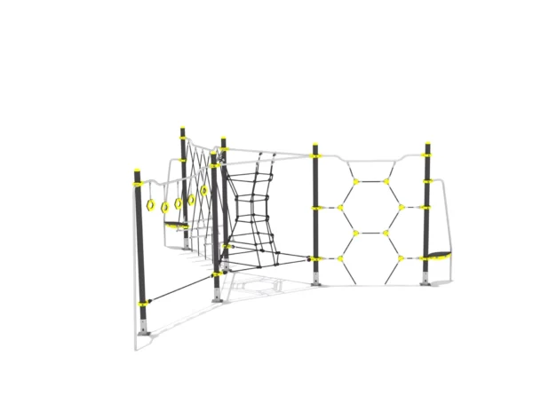 Drie-armig klim- en balanceertoestel met verschillende netstructuren, obstakels en glijstangen.