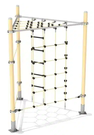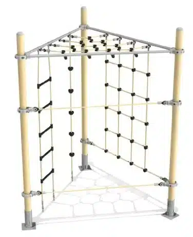 Driehoekig klimtoestel met netstructuren en een klimladder.