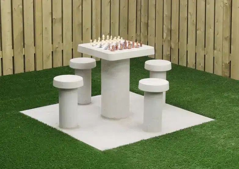 Breng strategisch spel en stijl samen in de openbare ruimte met deze robuuste betonnen schaaktafel, compleet met vier bijpassende zit plaatsen.