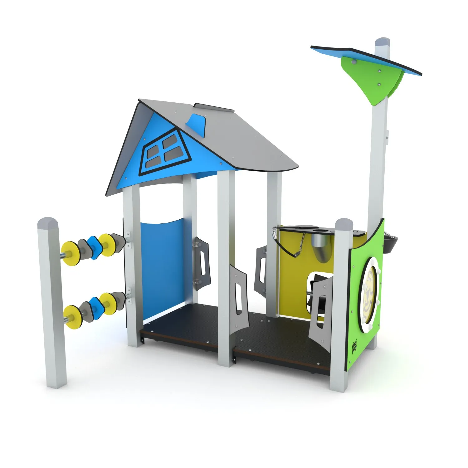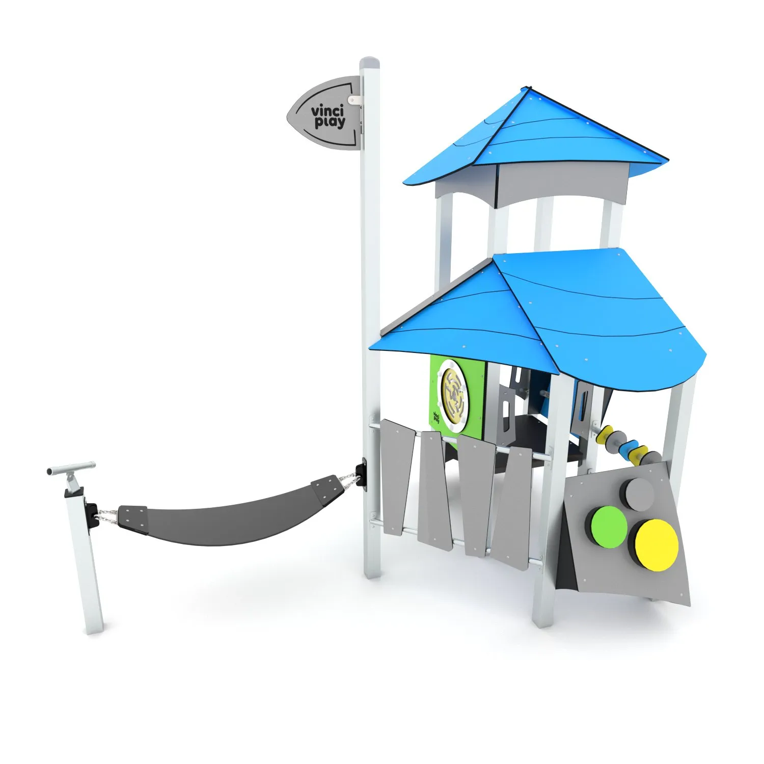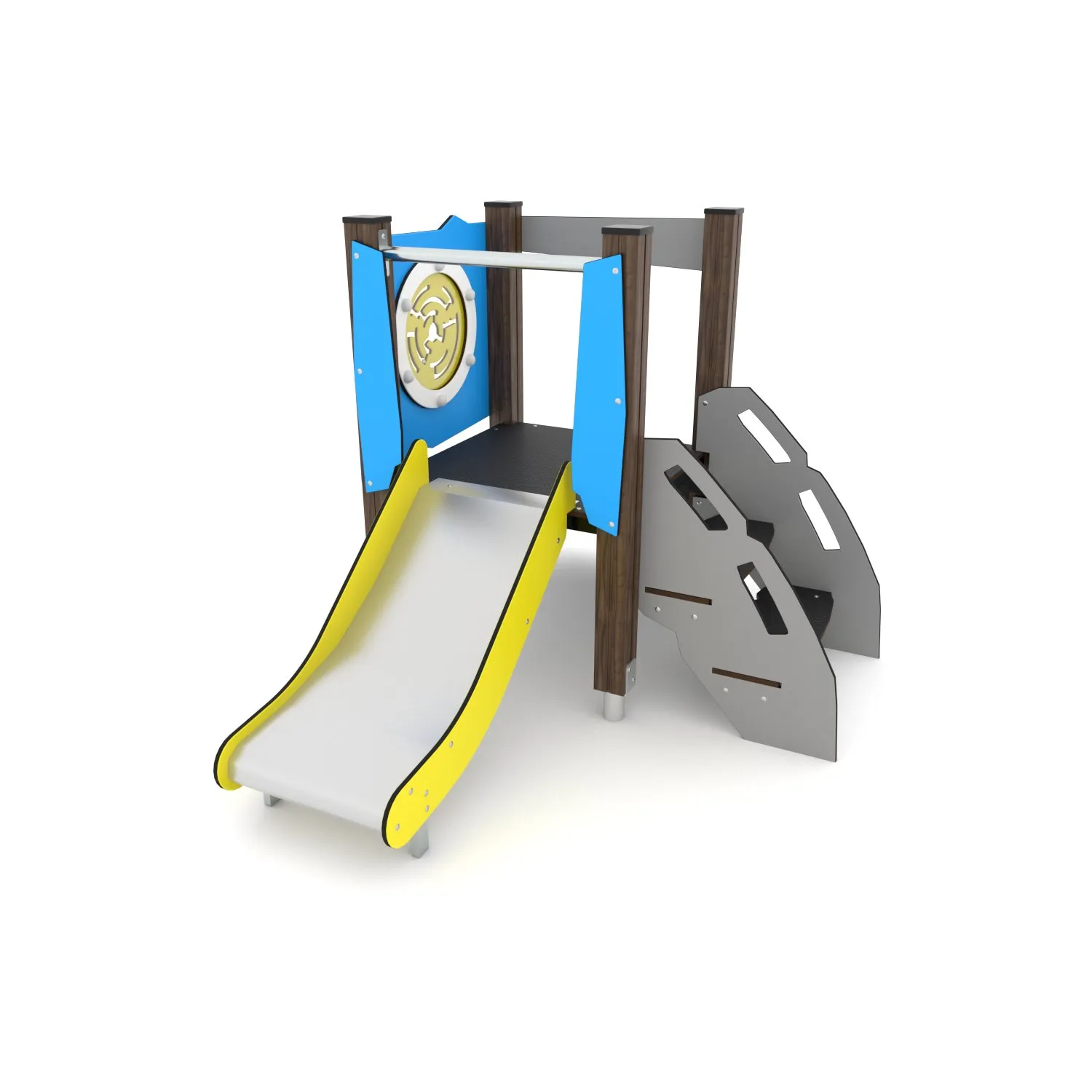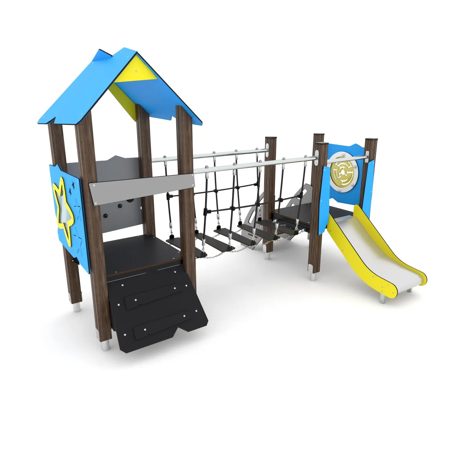 Het bijzondere en opvallende design van de Crooc serie is een lust voor het oog. Ook kwalitatief valt er niets op af te dingen, het plaatmateriaal is vervaardigd uit fraai afgewerkt HPL welke in frisse kleuren (blauw, geel en mintgroen) geleverd wordt. Daarnaast kan er tevens gekozen worden voorย de iets rustigere (en natuurlijke) bruine houtprint. De toestellen laten zich dan ook moeiteloos combineren met een avontuurlijke speeltuin.ย Staanders en stangen zijn standaard gemaakt van RVS, de buisglijbaan is eveneens geheel RVS.