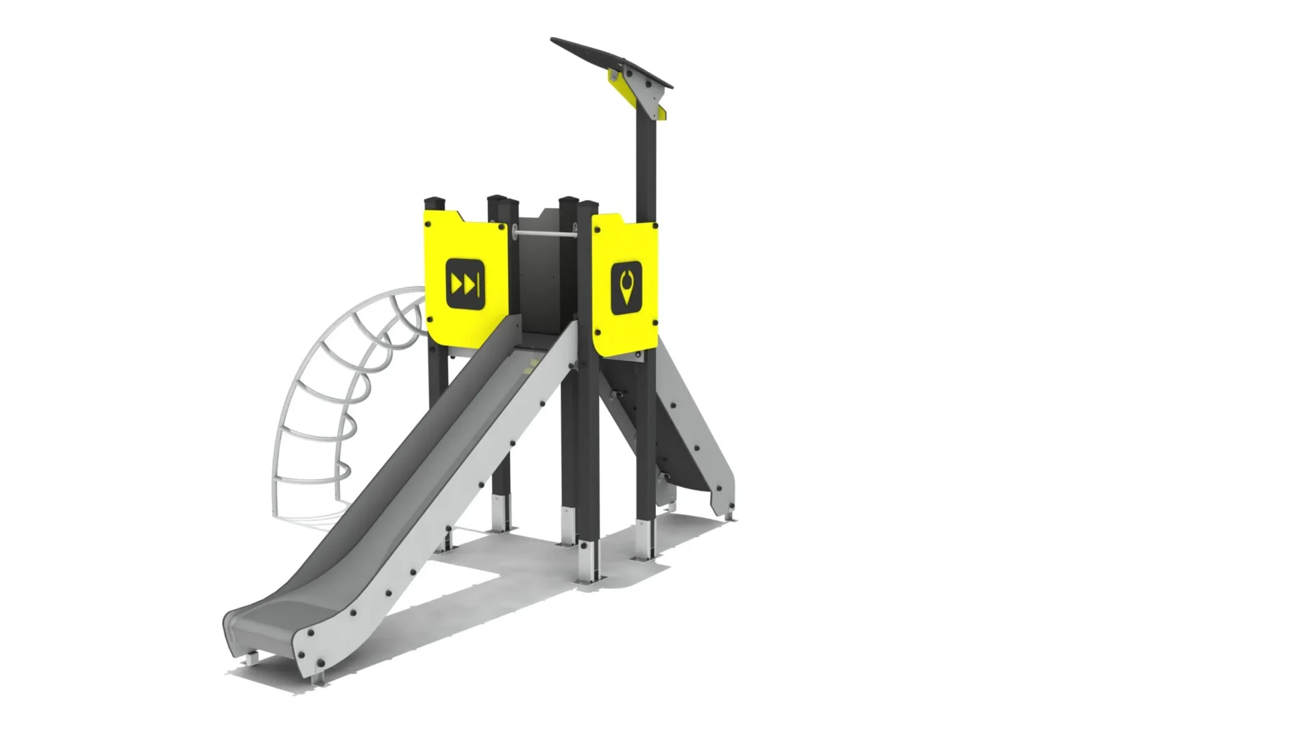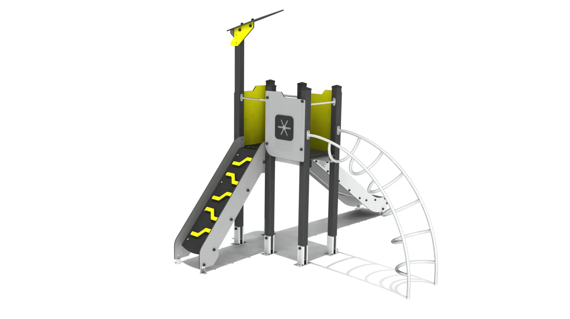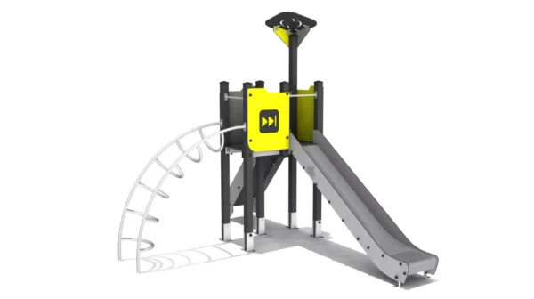 Een klim- en glijcombinatie met een glijbaan en verschillende klimelementen.