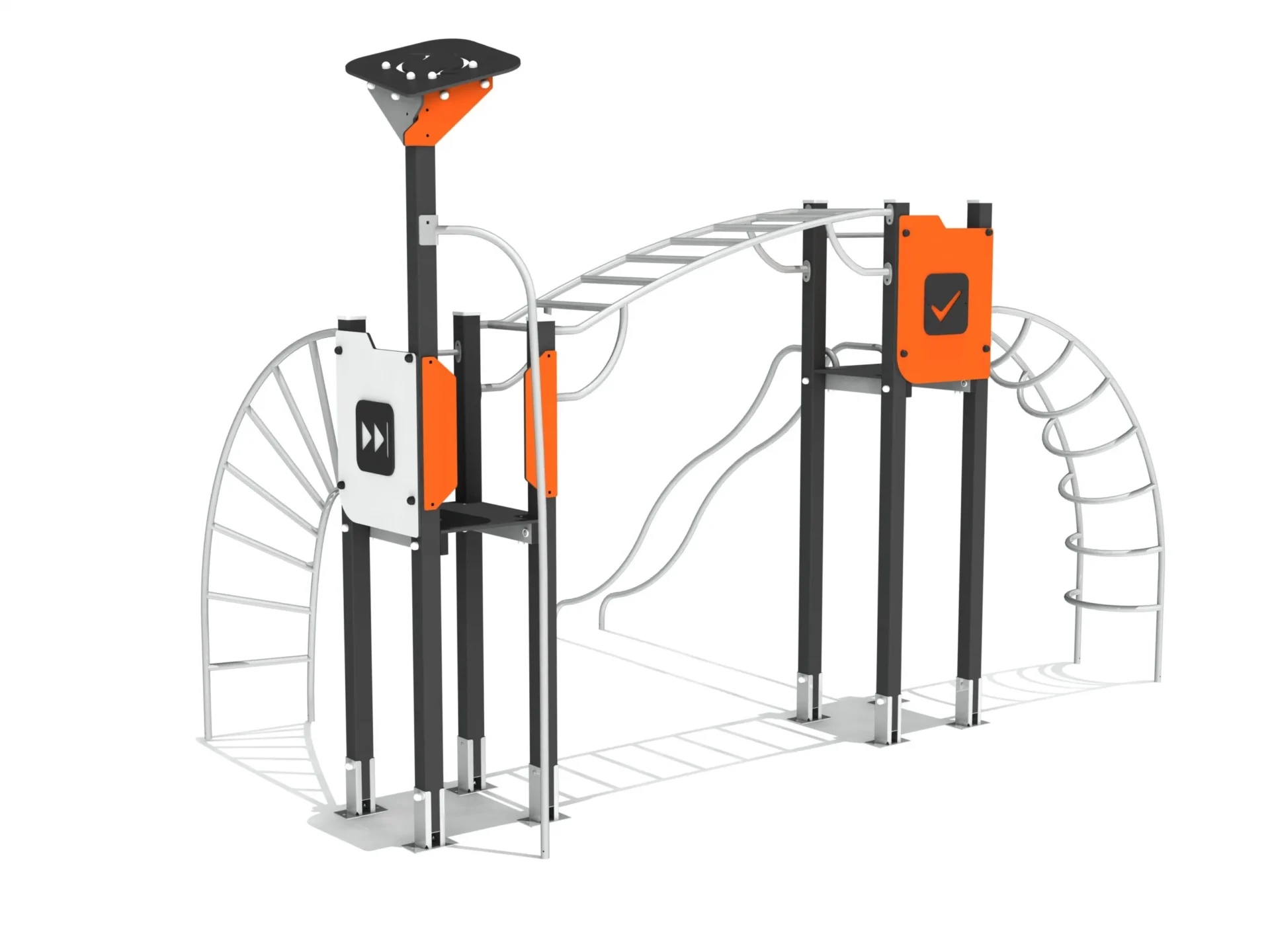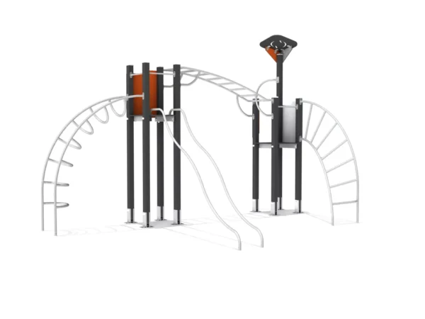 Een uitdagende klim- en klautercombinatie met verschillende klimladders, monkeybar en glijstangen.