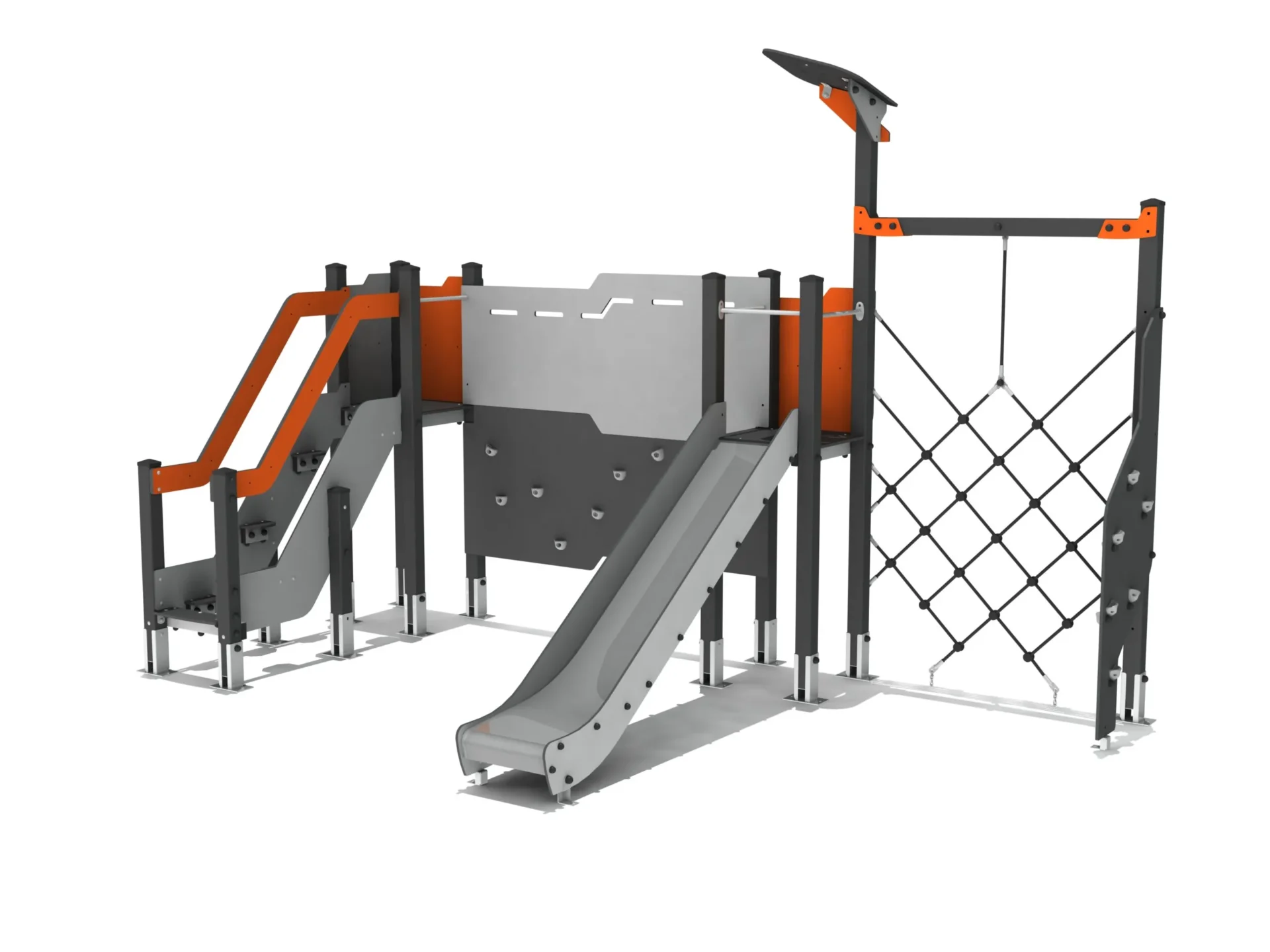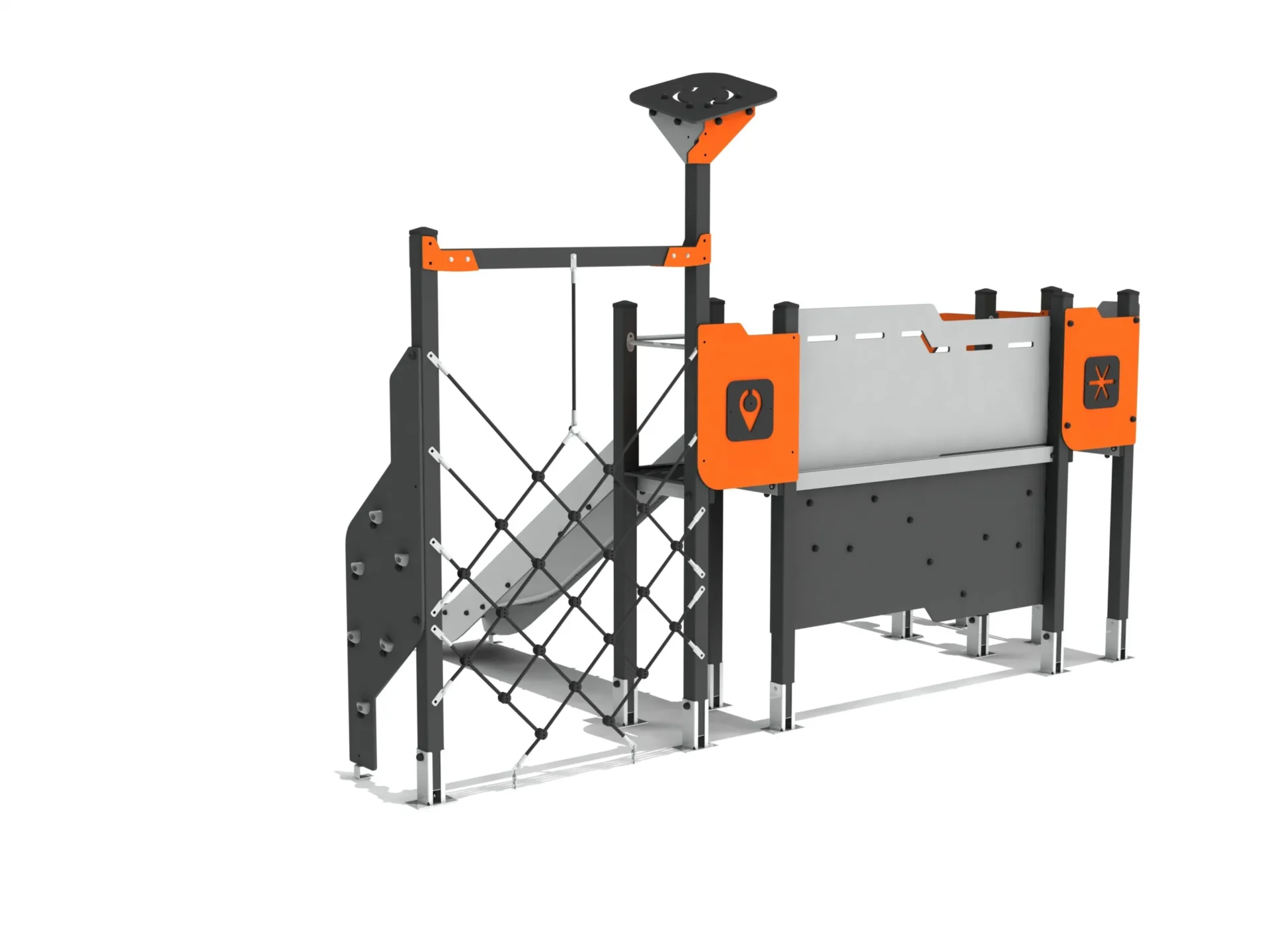 klim- en klautercombinatie met een klimwand, klimladder en netconstructie.