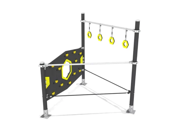 Een driehoekig klimelement met klimwand en ringen.