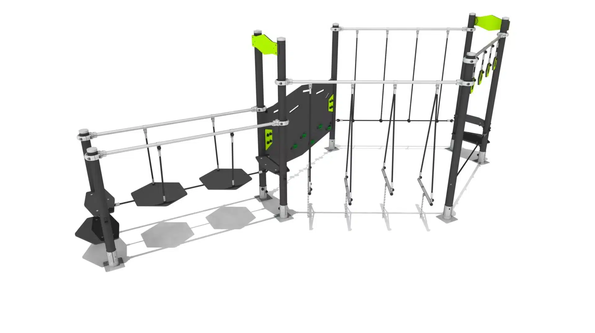 Een klimelement met ringen, touwen en een klimwand.