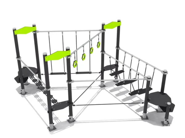 Een balanceerobstakel met ringen, touwen en touwbruggen.