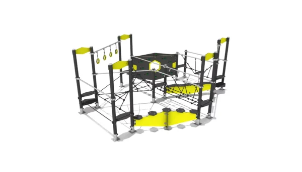 Een groot, zeshoekig balanceerobstakel met verschillende wiebelbruggen, klimwand en netstructuur.
