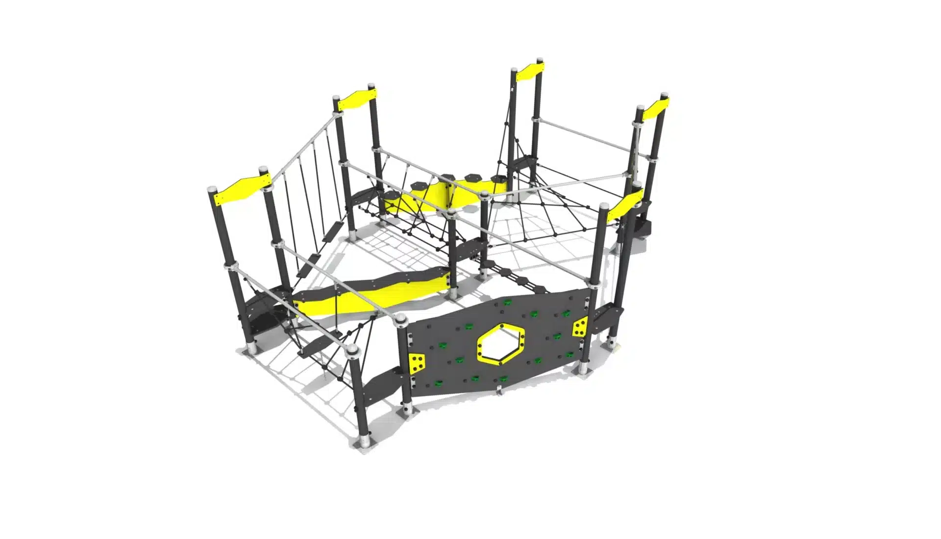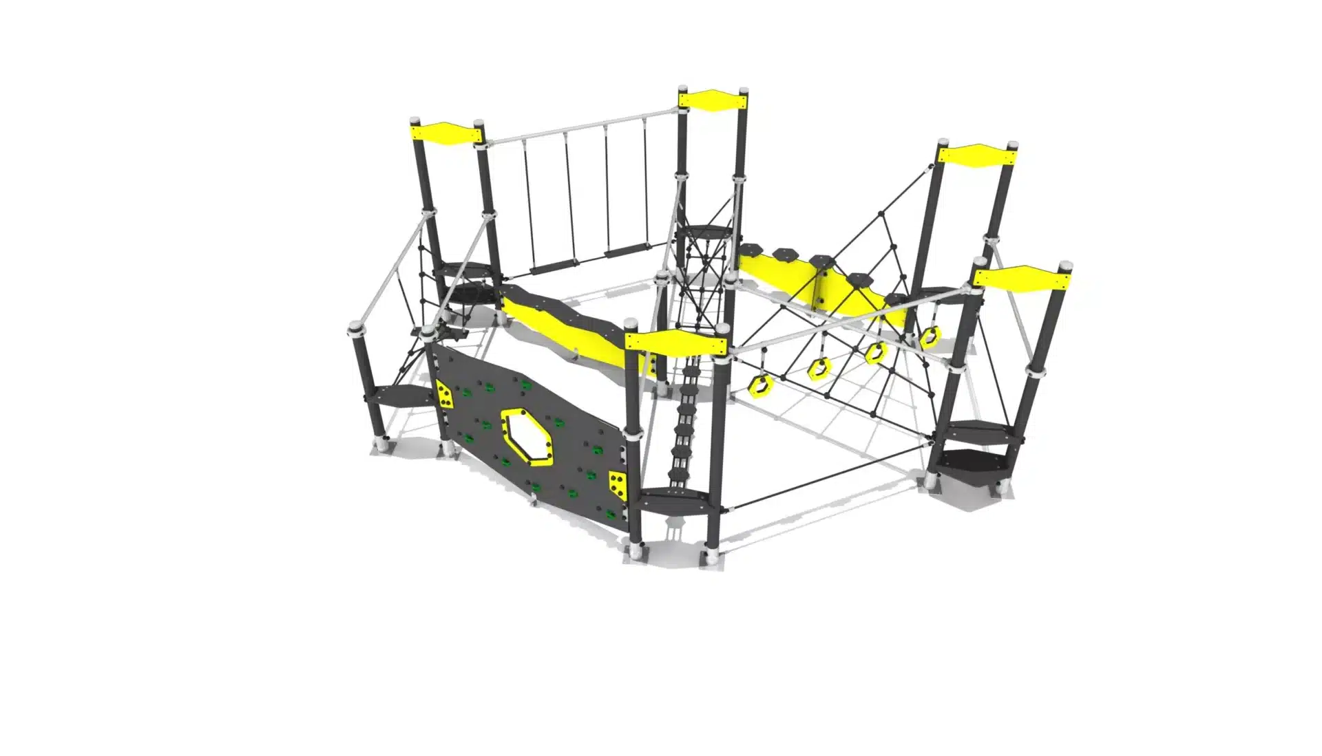 zeshoekig balanceerobstakel met verschillende wiebelbruggen, klimwand en