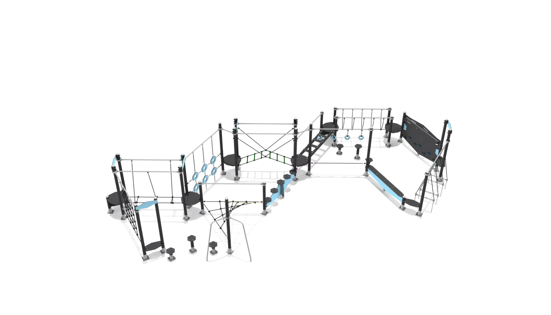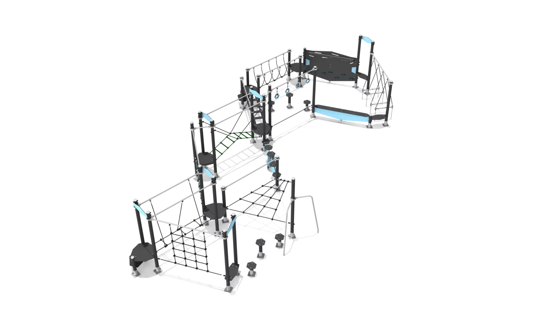 balanceer- en klimelement met veel verschillende wiebelbruggen, touwen en