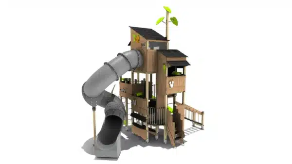 Een groot thematisch klim- en klautercombinatie met een buisglijbaan, speelmuur en trap.