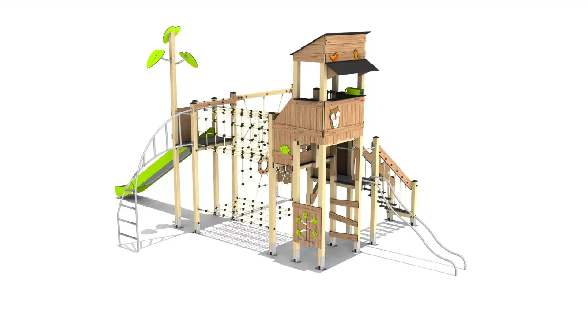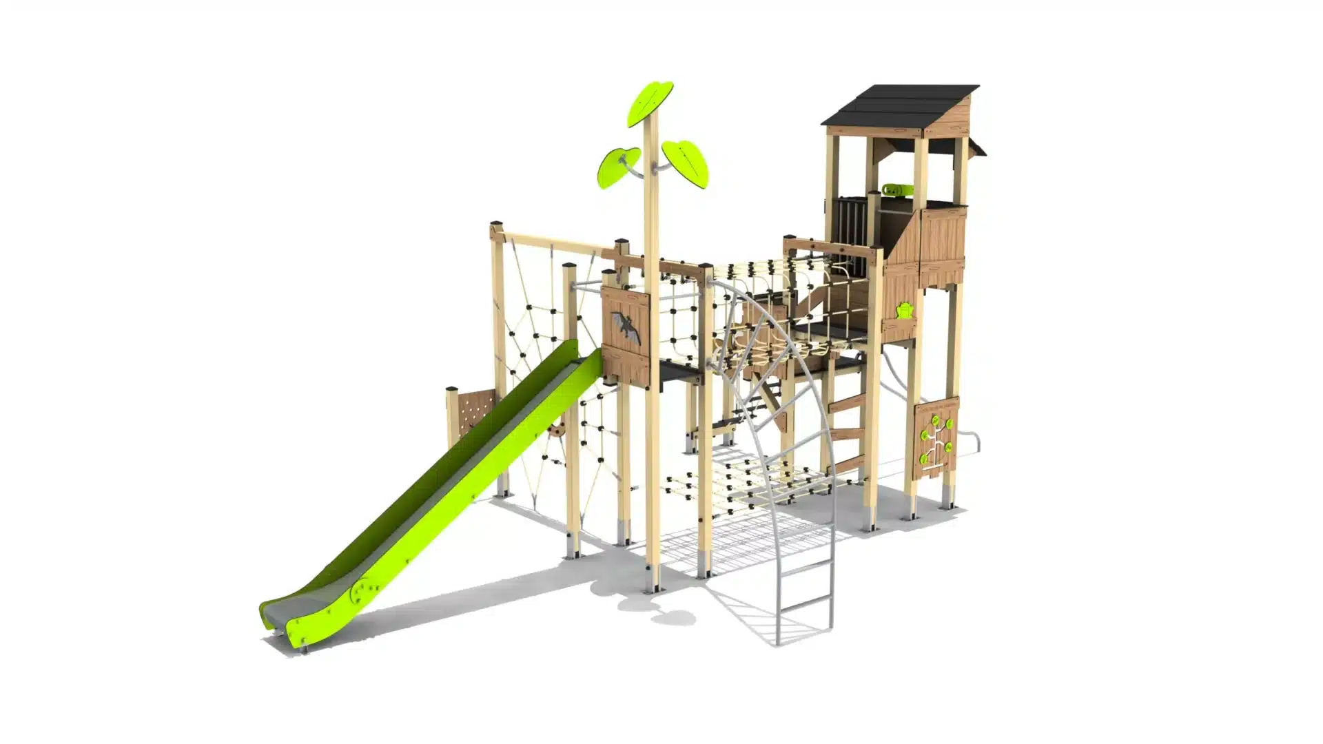 klim- en klautercombinatie met een glijbaan en verschillende netstructuren.