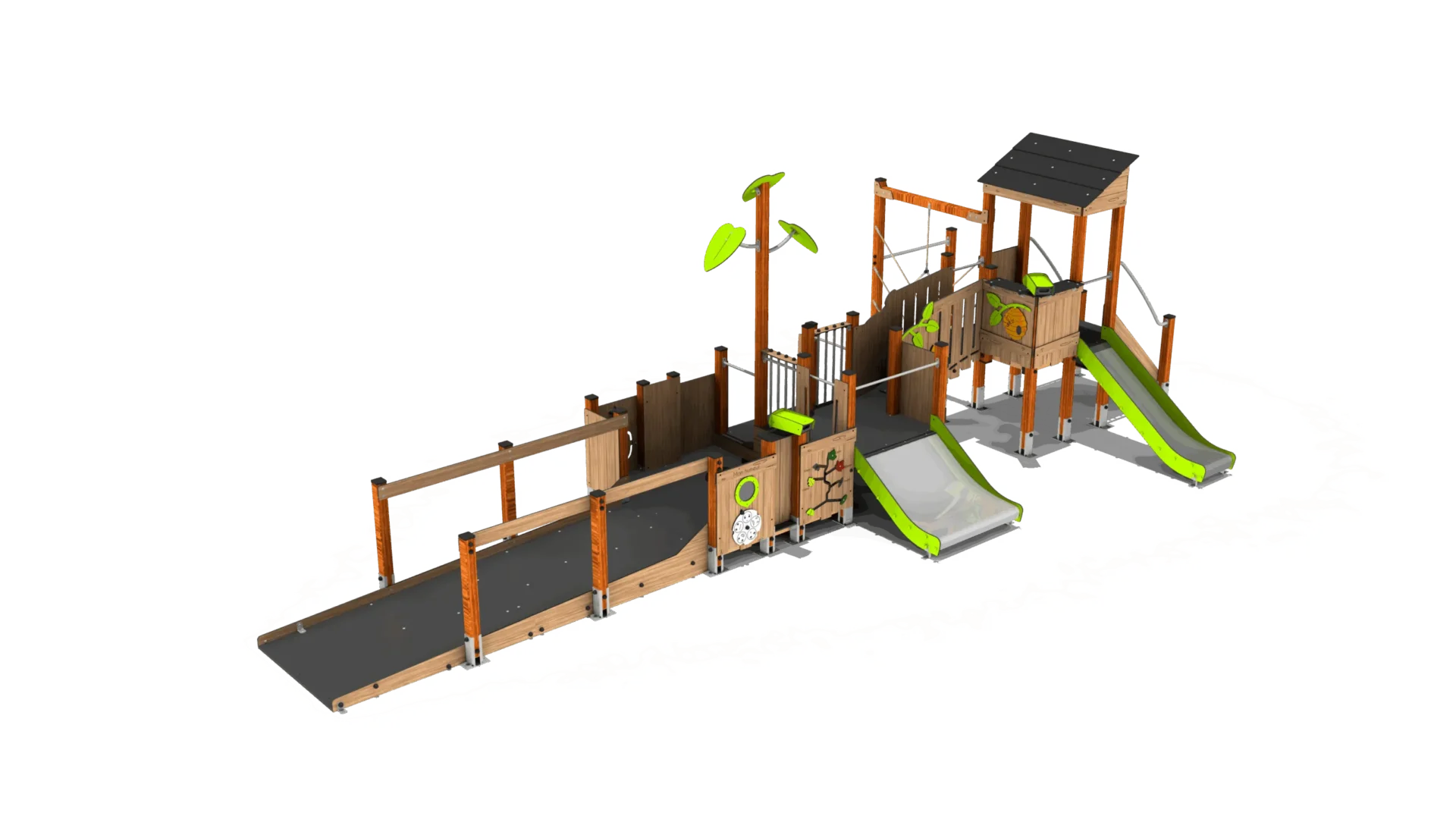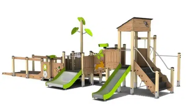 Een inclusief en thematisch speeltoestel met verschillende spelelementen en twee glijbanen.