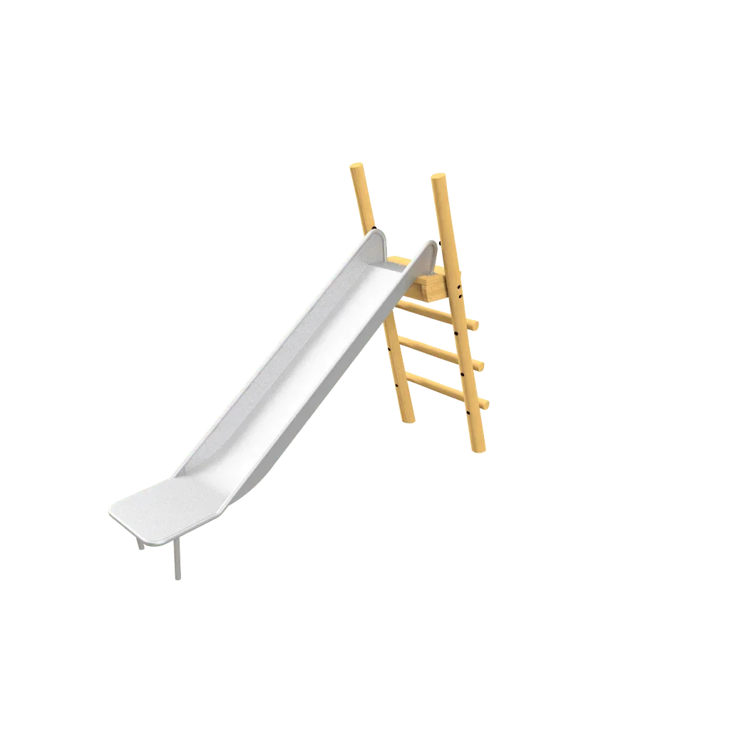Dit moderne speeltoestel combineert klimmen, klauteren en glijden in één compacte en dynamische constructie. Het toestel bestaat uit een verhoogd platform, veilig omsloten met houten panelen, dat kinderen een gevoel van hoogte en avontuur geeft. Vanaf het platform glijden ze soepel naar beneden via een stevige RVS-glijbaan, die garant staat voor snelheid én duurzaamheid.