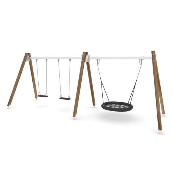 Strak vormgegeven Schommelcombi met een vogelnestschommel en twee standaard zitjes waarbij optioneel voor andere zitjes gekozen kan worden.