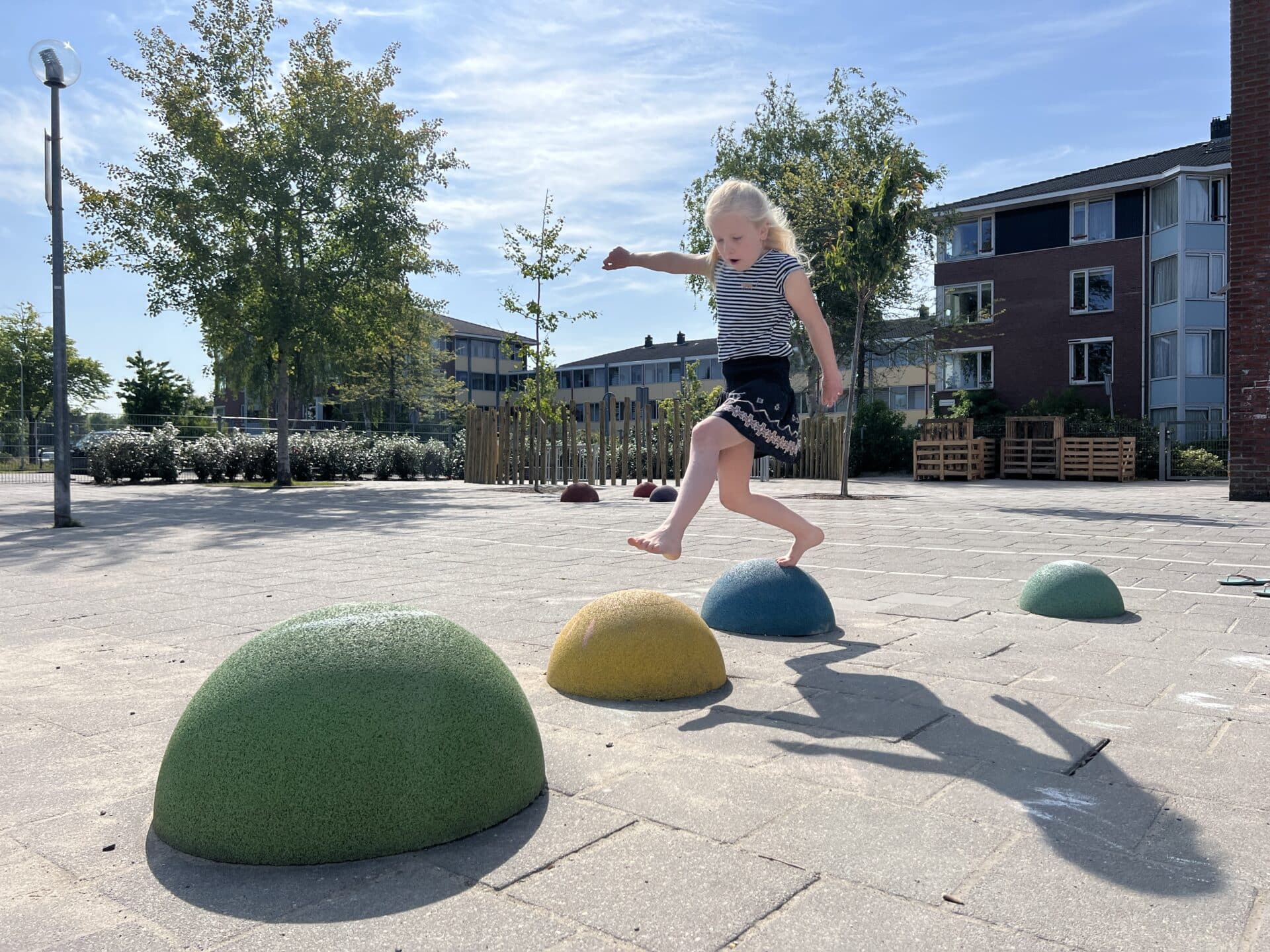 Het resultaat is een beweeg- en leerplein dat kinderen volop uitdaagt én ruimte biedt voor ontspanning. Zo zijn er een duikelrek, speelcombinatie WD1452 , JolleBollen en verschillende balanceerelementen en schommels geplaatst die bijdragen aan de nodige uitdaging, motorische ontwikkeling en creatief spel. Voor sport en competitie zorgen de twee minigoals, waarmee het plein ook een aantrekkelijke plek is om samen te voetballen.
