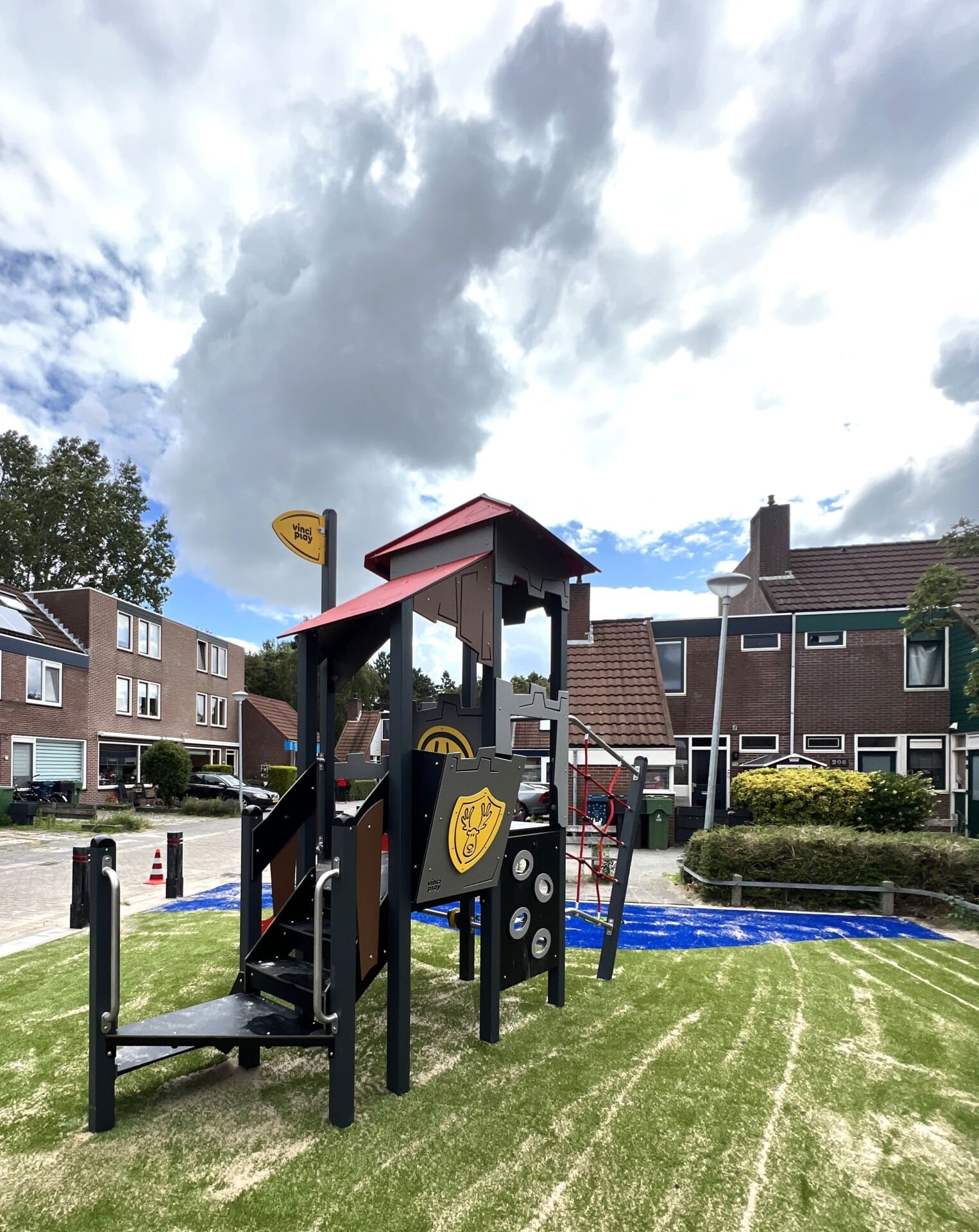 Voor Gemeente Alkmaar mochten wij speelplek Vlietwaard renoveren.  Oude toestellen eruit en een mooie nieuwe speelplek maken.  Keuze viel op de CS3003 uit de Castillo serie van Vinciplay.  Dit uitdagende speelkasteel heeft veel leuke speelmogelijkheden die op een betrekkelijk kleine speelplek passen.  Glijden, klimmen, rollenspel, diverse speelaanleidingen… je vind het allemaal op dit leuke toestel.  Bijpassend een fijne duo wip op het valdempende kunstgras welke is voorzien van een aantal kleurrijke toevoegingen zoals een “slotgracht met brug” en een verstopte vleermuis.