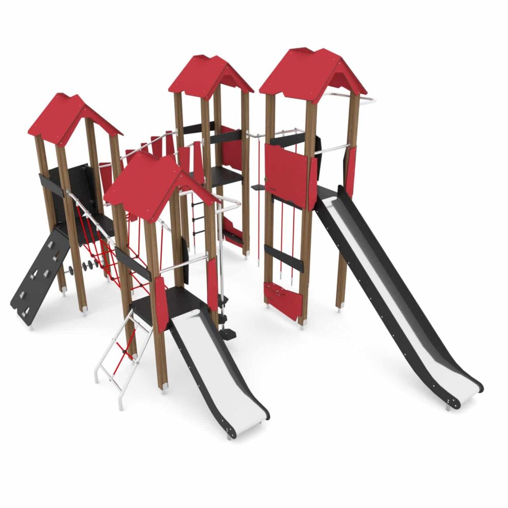 Groot combinatie speeltoestel WD1412 bij de Basisschool de Regenboog in Voorthuizen geplaatst. Toestel bestaat uit een viertal torens welke met bruggen en klimattributen aan elkaar verbonden zijn. Oneindig veel speelplezier op dit toestel is het eindresultaat. Door de combinatie van grenen staanders, rvs en groen HPL past dit toestel heel goed in een natuurlijke omgeving.