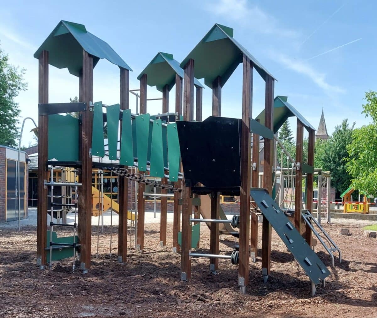 Groot combinatie speeltoestel WD1412 bij de Basisschool de Regenboog in Voorthuizen geplaatst. Toestel bestaat uit een viertal torens welke met bruggen en klimattributen aan elkaar verbonden zijn. Oneindig veel speelplezier op dit toestel is het eindresultaat. Door de combinatie van grenen staanders, rvs en groen HPL past dit toestel heel goed in een natuurlijke omgeving.