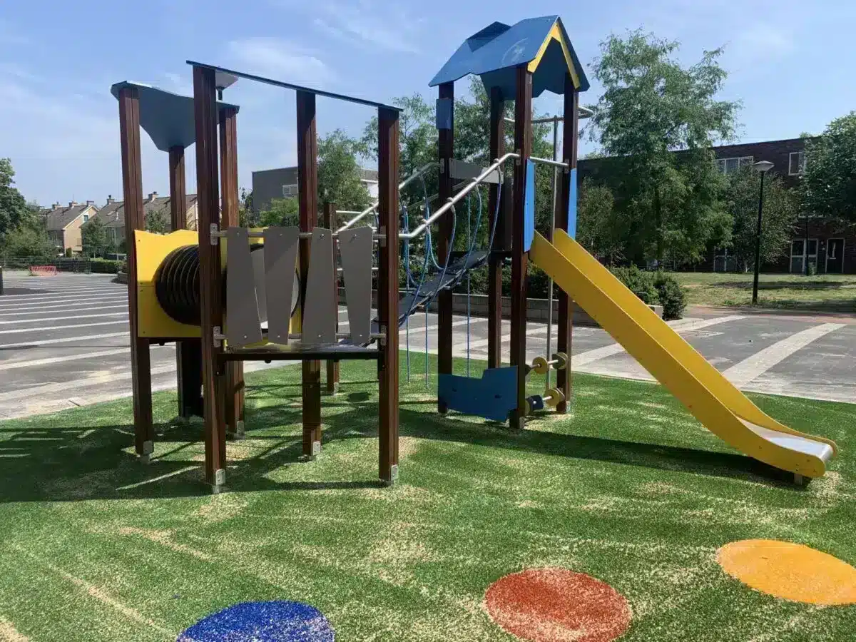 Aan de leerlingen van basisschool de Paperclip in Heerhugowaard de eer om een nieuw speeltoestel te kiezen. Het oude speeltoestel aan de voorzijde van de school was echt aan vervanging toe. De leerlingen hadden goed nagedacht over wat ze voor ogen hadden. Aan Hercules Speeltoestellen de beurt om enkele voorstellen te maken. Hieruit hebben de leerlingen een keus gemaakt: speelcombinatie WD1409. Dit toestel in de HDPE versie (ook leverbaar in HPL versie) biedt veel klimmogelijkheden voor verschillende leeftijdscategorieën. Verder sluiten “de looks” van het toestel goed aan bij het moderne schoolgebouw.
