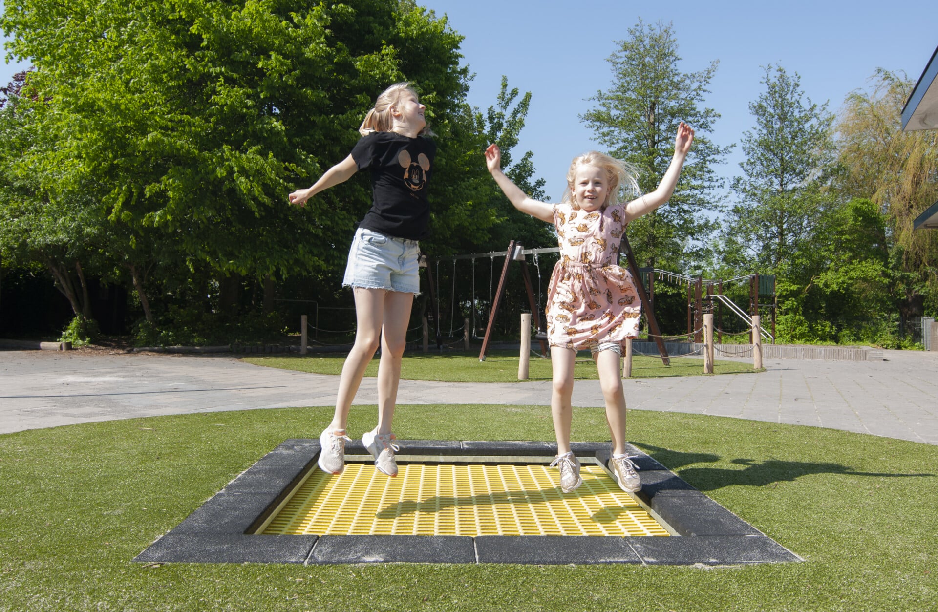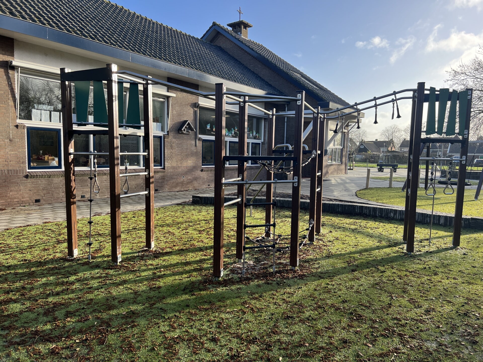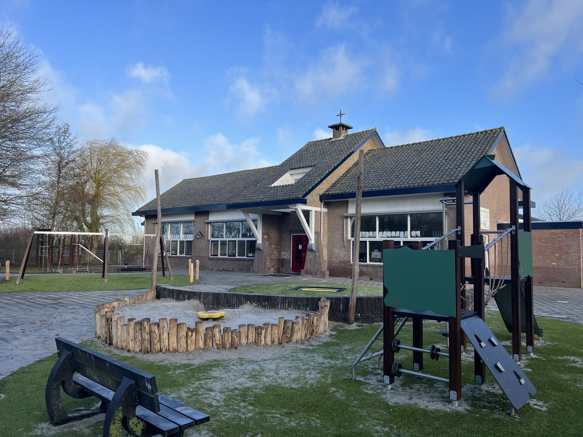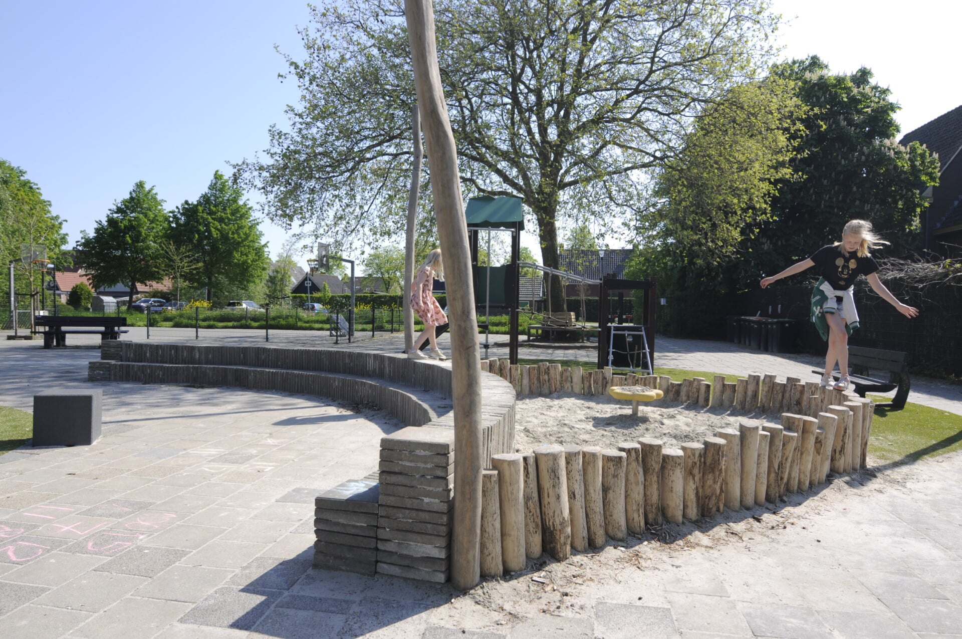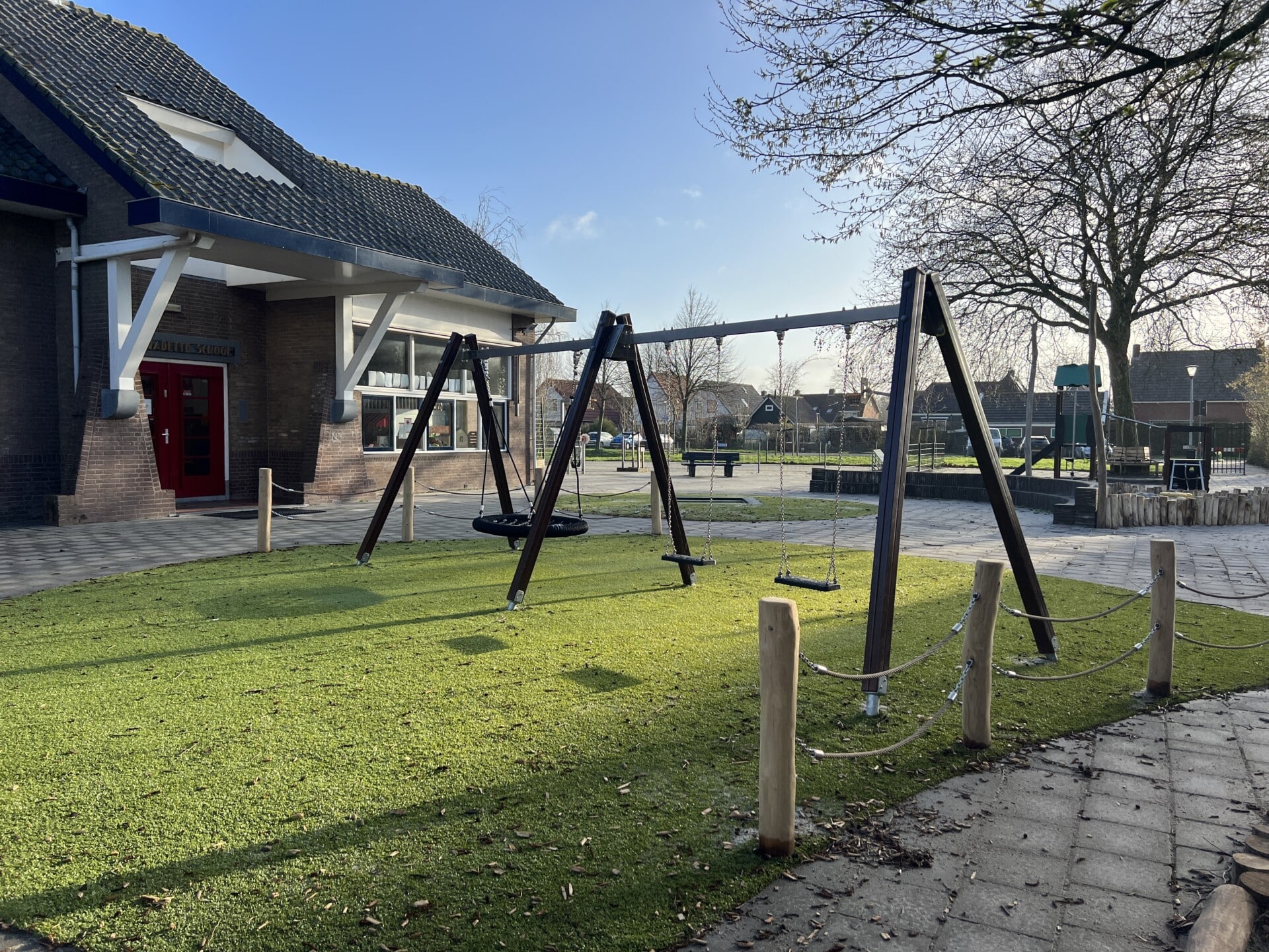 Van een grauwe vlakte met veel betontegels en primair gekleurde toestellen is de ruimte rond de school omgetoverd tot een avontuurlijk plein met groen karakter dat goed te onderhouden is. Naast een enorme diversiteit aan speelwaarde is er een moestuin aangelegd en heeft het plein een centrale buitenklas.