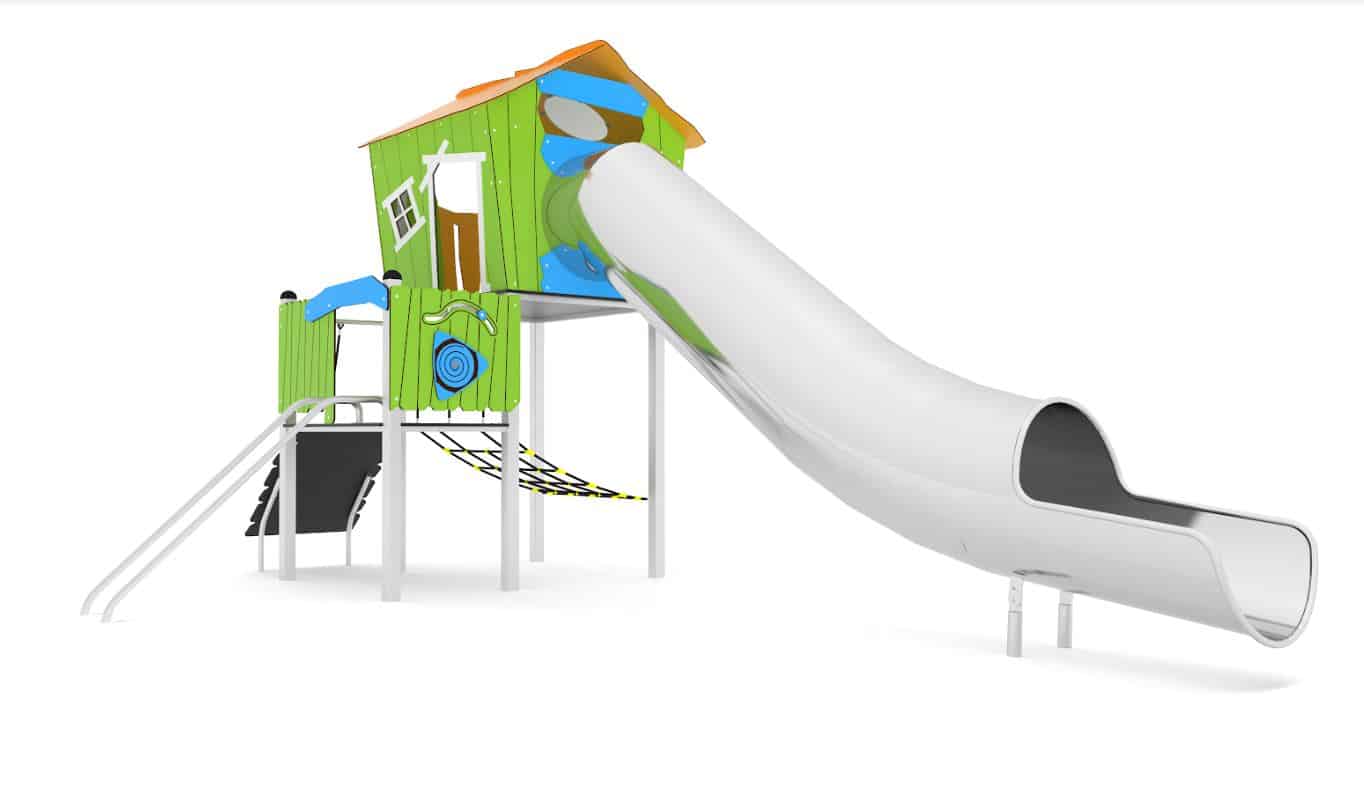 Speelcombinatie met RVS buisglijbaan, klimelementen en glijstangen