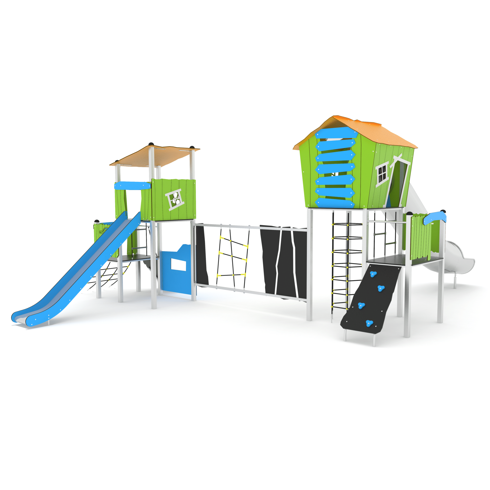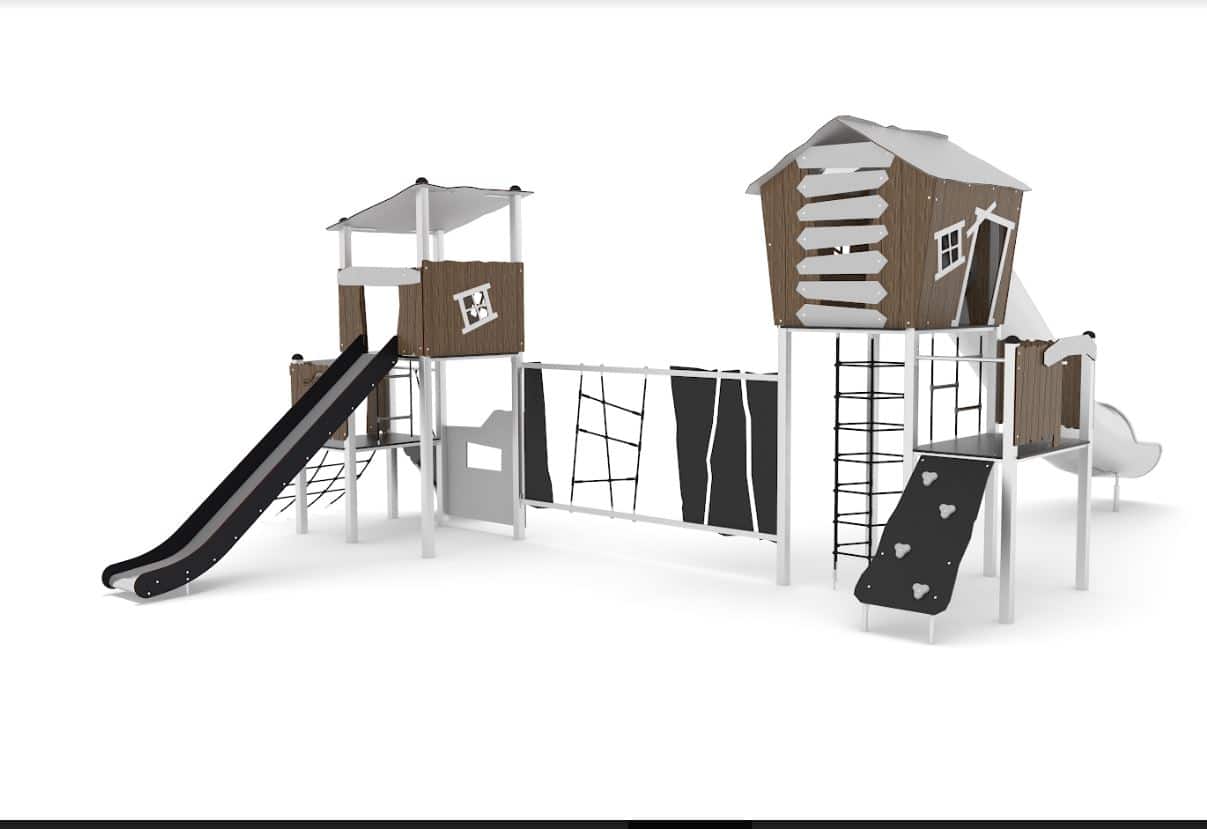 Speelcombinatie met 2 torens met glijstangen, klimelementen, PE buisglijbaan en een standaard glijbaan