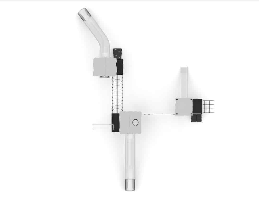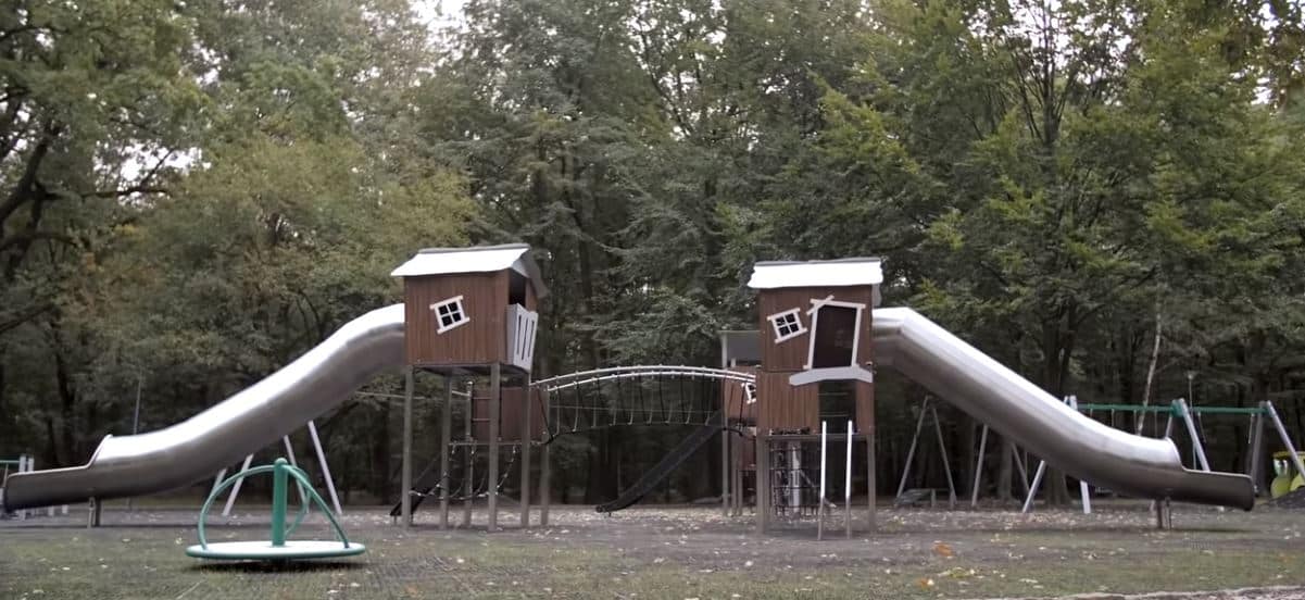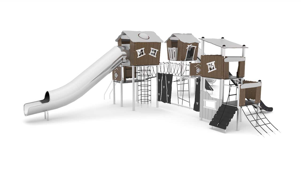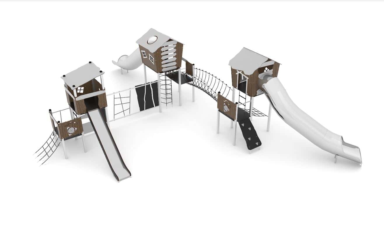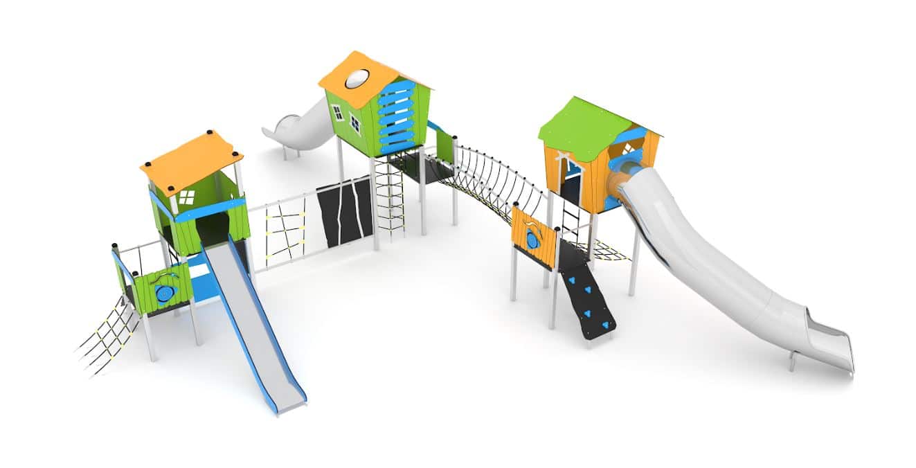 Speelcombinatie met 3 torens met glijstangen, klimelementen, netbrug 2 RVS buisglijbanen en een standaard glijbaan