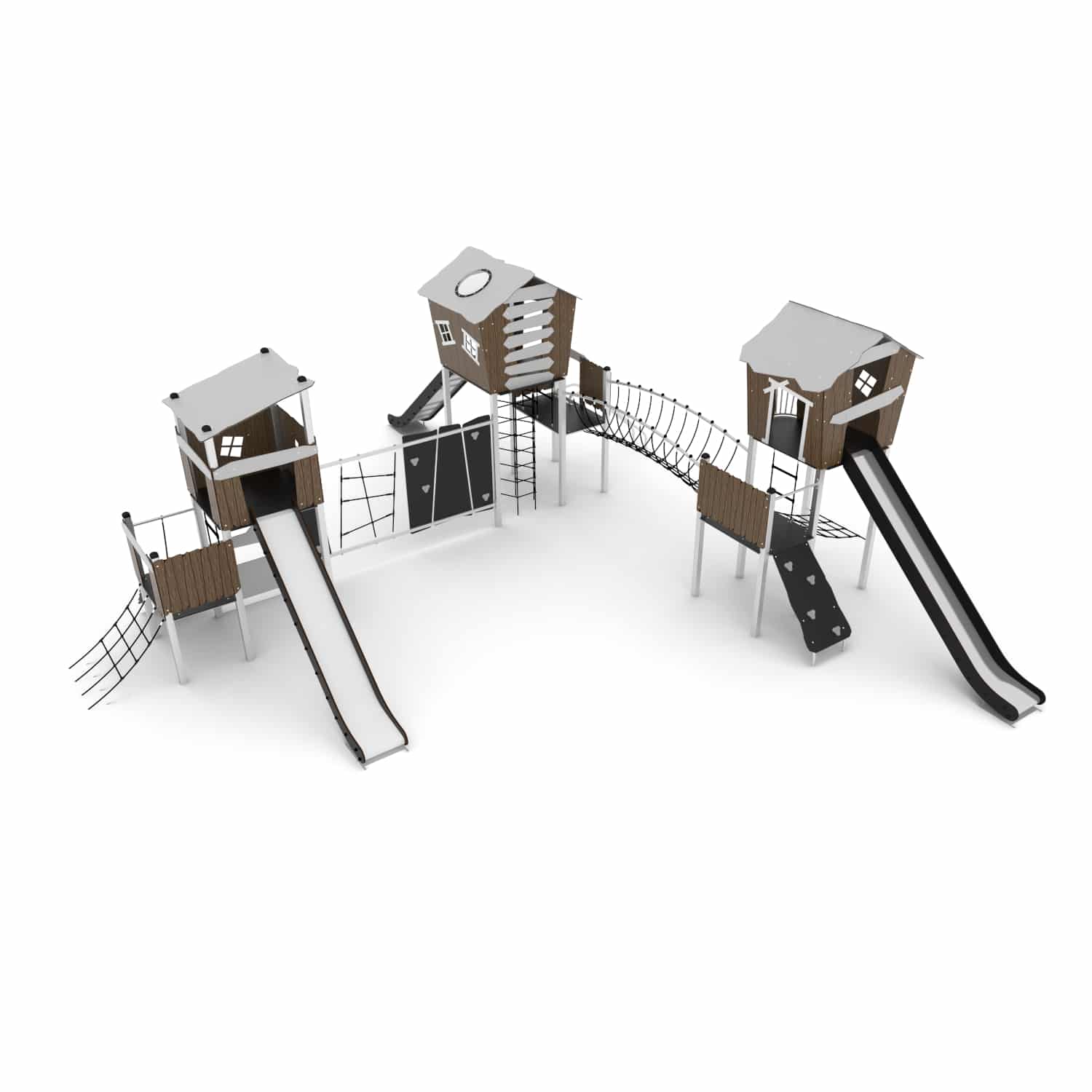 Speelcombinatie ‘S1’ met 3 torens met glijstangen, klimelementen, netbrug en 3 standaard glijbanen