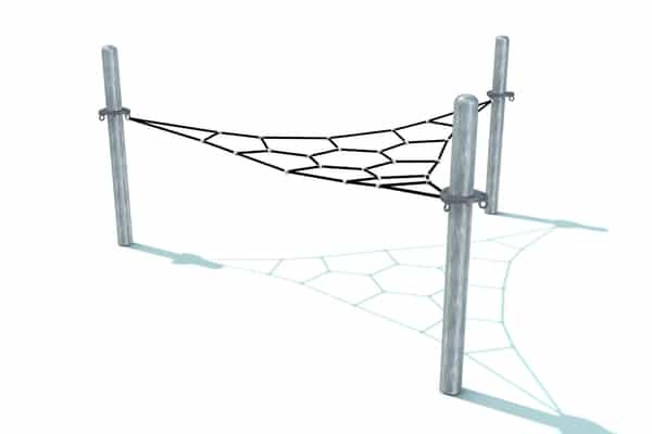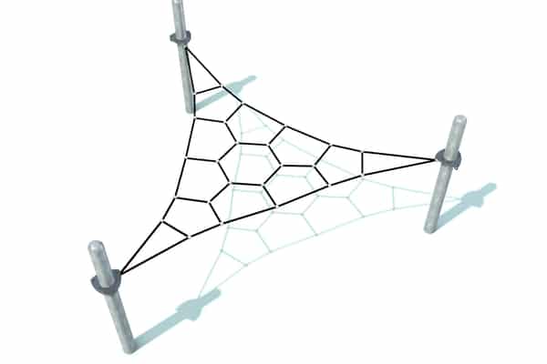 Horzizontaal en uitdagend klimelement met geometrische netstructuren. Door de beperkte valhoogte is plaatsing op een natuurlijke bodem mogelijk. Hoogwaardige kabels zijn met gegalvaniseerde staanders gecombineerd.