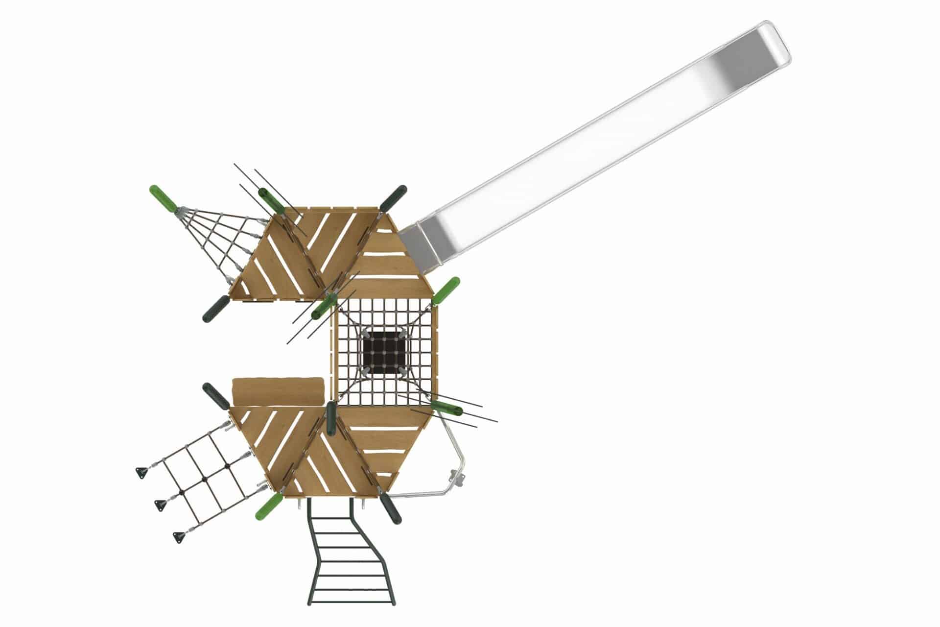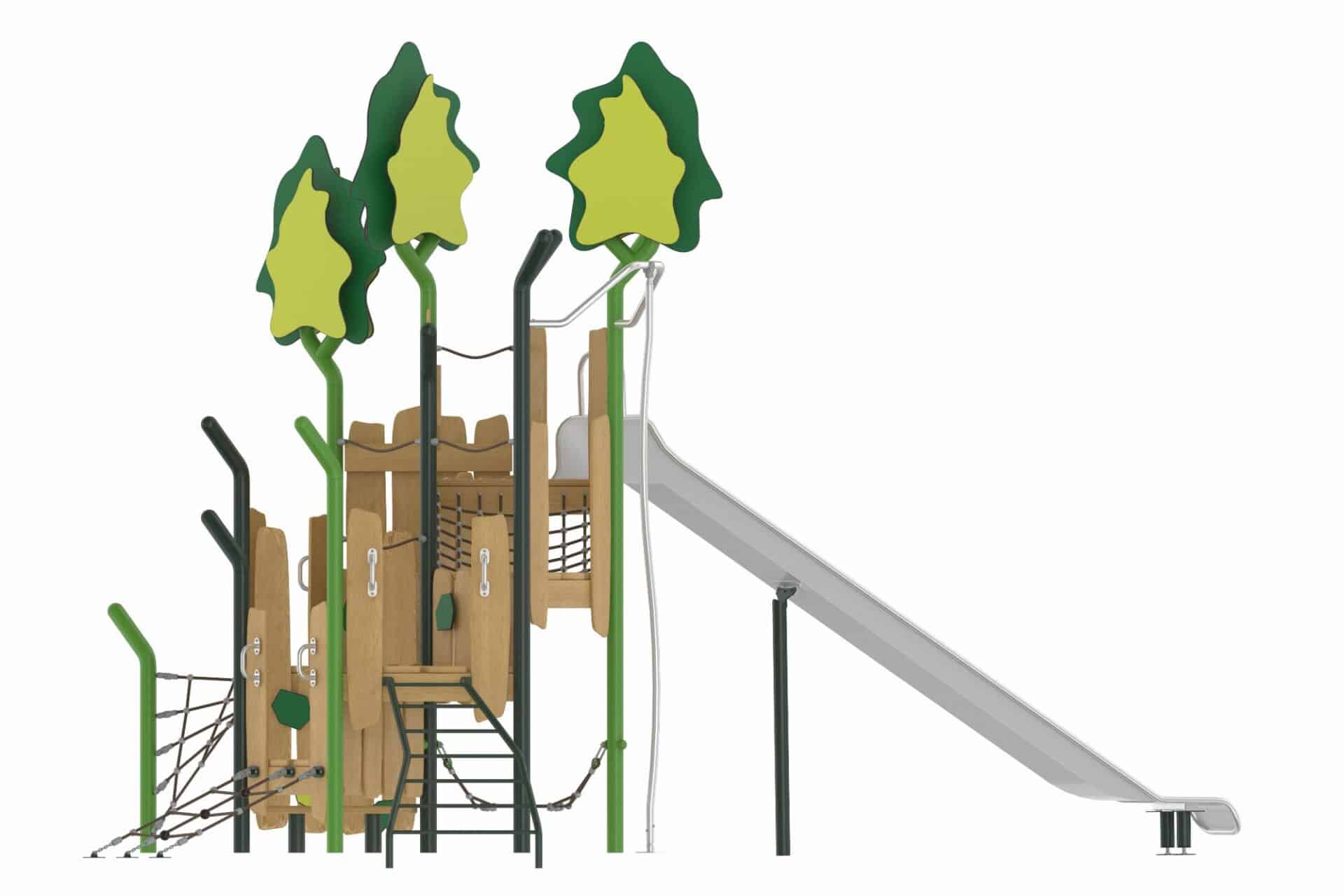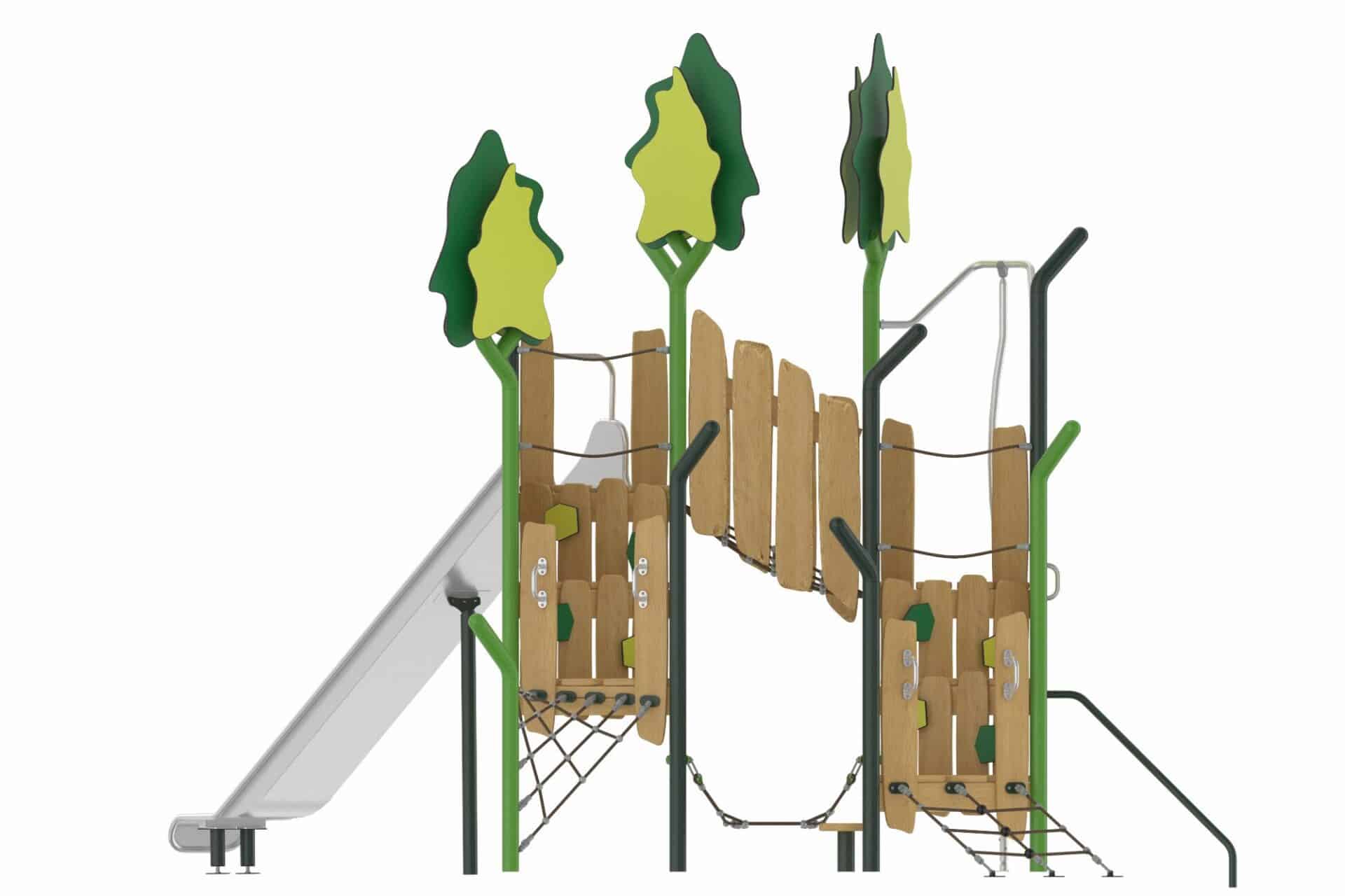 De Evergreen-serie speeltoestellen combineert eigentijdse materialen met een natuurlijke uitstraling. Het duurzame, robuuste frame van gepoedercoate stalen staanders in een organische vorm staat garant voor een lange levensduur. Robinia houten panelen en zorgvuldig gekozen natuurtinten geven de torens een warme en uitnodigende uitstraling die perfect past in elke omgeving.