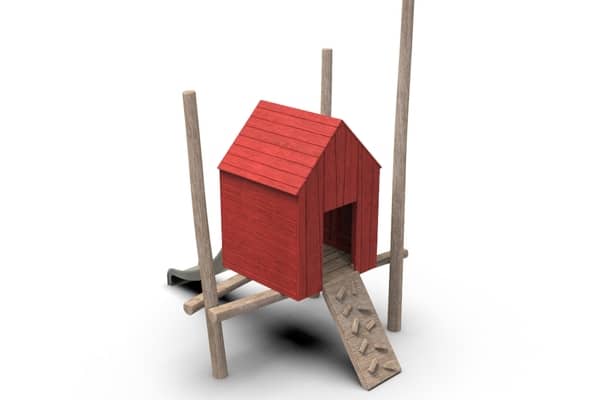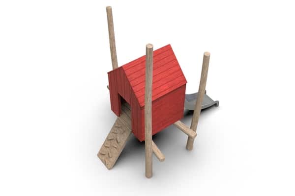 Rood speelhuis op palen met rvs glijbaan en opgang met klimgrepen.