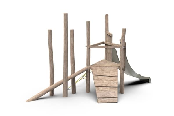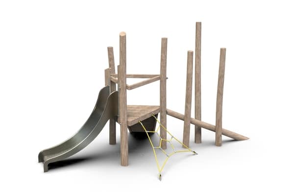 Speelschip op palen met kajuit, voorsteven, stuurwiel, balanceerbalken en rvs glijbaan.
