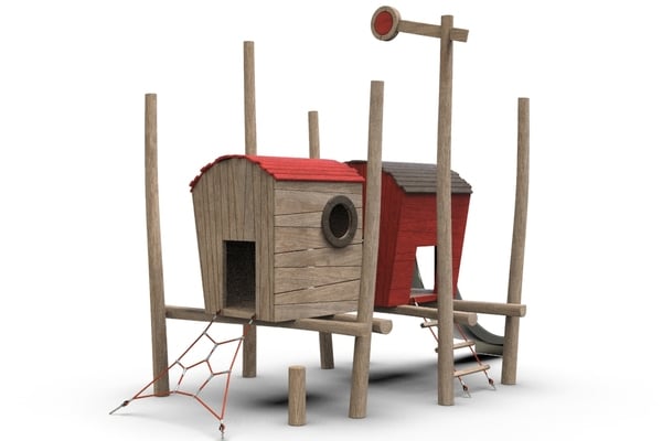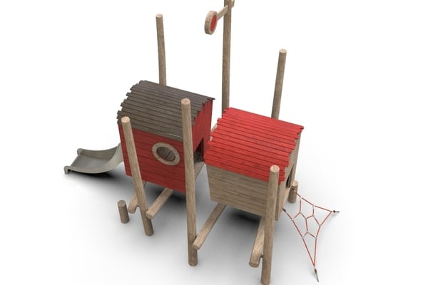 Dubbele hut op palen met rvs glijbaan en klimnetten.