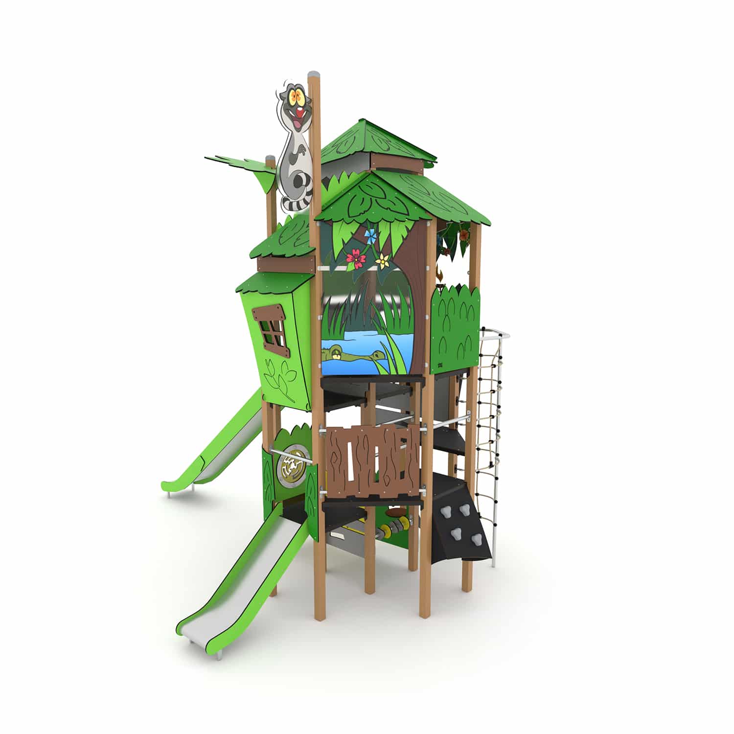 De Jungle serie bestaat uit een indrukwekkende serie speelcombinaties in Junglethema. Door de thematisch vormgegeven speeltoestellen kan rollenspel tot ware kunst verheven worden. Daarnaast raak je niet uitgespeeld door de vele manipulatieve elementen die in de producten verwerkt zijn. Binnen de serie is er niet bespaard op kwaliteit. Hoogwaardige verzinkte stalen staanders met coating vormen de stabiele basis, plaatwerk is vervaardigd uit hoogwaardig HDPE en HPL kunststof en bruggen en klimnetten zijn van staalversterkt touwwerk. Met torens tot wel 9.00 meter hoog kan er op verschillende niveaus worden gespeeld en zijn de RVS buisglijbanen een regelrechte hit!