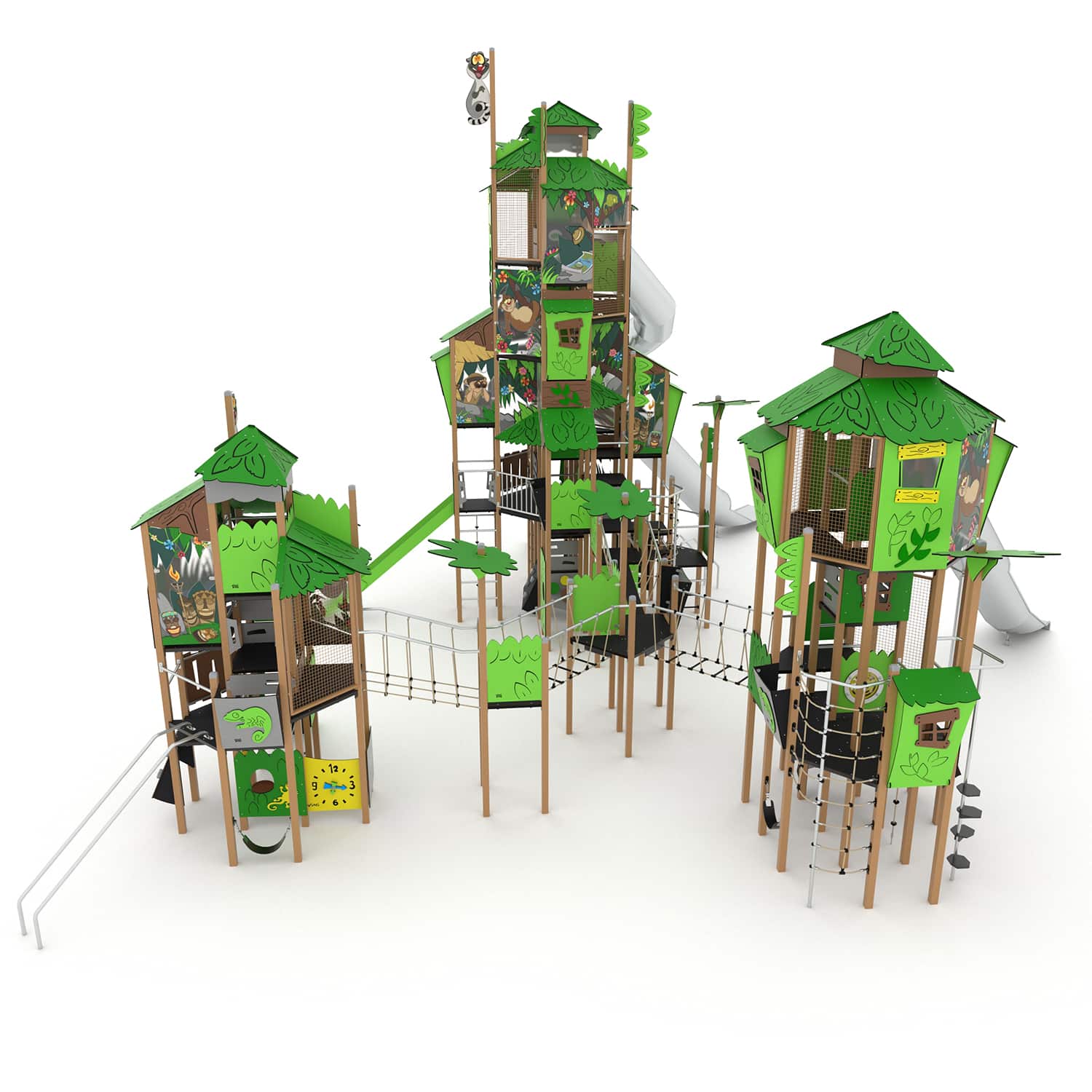 De Jungle serie bestaat uit een indrukwekkende serie speelcombinaties in Junglethema. Door de thematisch vormgegeven speeltoestellen kan rollenspel tot ware kunst verheven worden. Daarnaast raak je niet uitgespeeld door de vele manipulatieve elementen die in de producten verwerkt zijn. Binnen de serie is er niet bespaard op kwaliteit. Hoogwaardige verzinkte stalen staanders met coating vormen de stabiele basis, plaatwerk is vervaardigd uit hoogwaardig HDPE en HPL kunststof en bruggen en klimnetten zijn van staalversterkt touwwerk. Met torens tot wel 9.00 meter hoog kan er op verschillende niveaus worden gespeeld en zijn de RVS buisglijbanen een regelrechte hit!