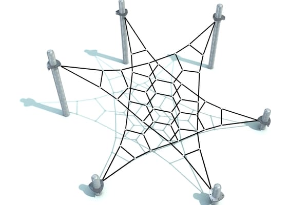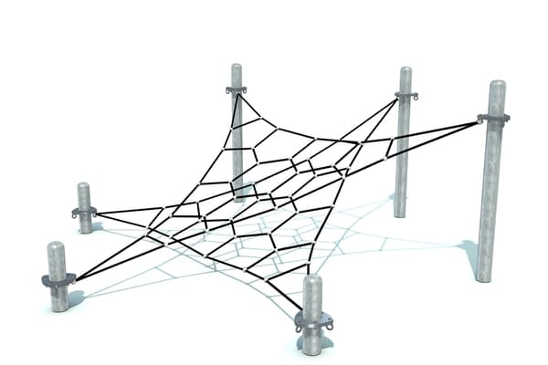 Horzizontaal en uitdagend klimelement met geometrische netstructuren. Door de beperkte valhoogte is plaatsing op een natuurlijke bodem mogelijk. Hoogwaardige kabels zijn met gegalvaniseerde staanders gecombineerd.