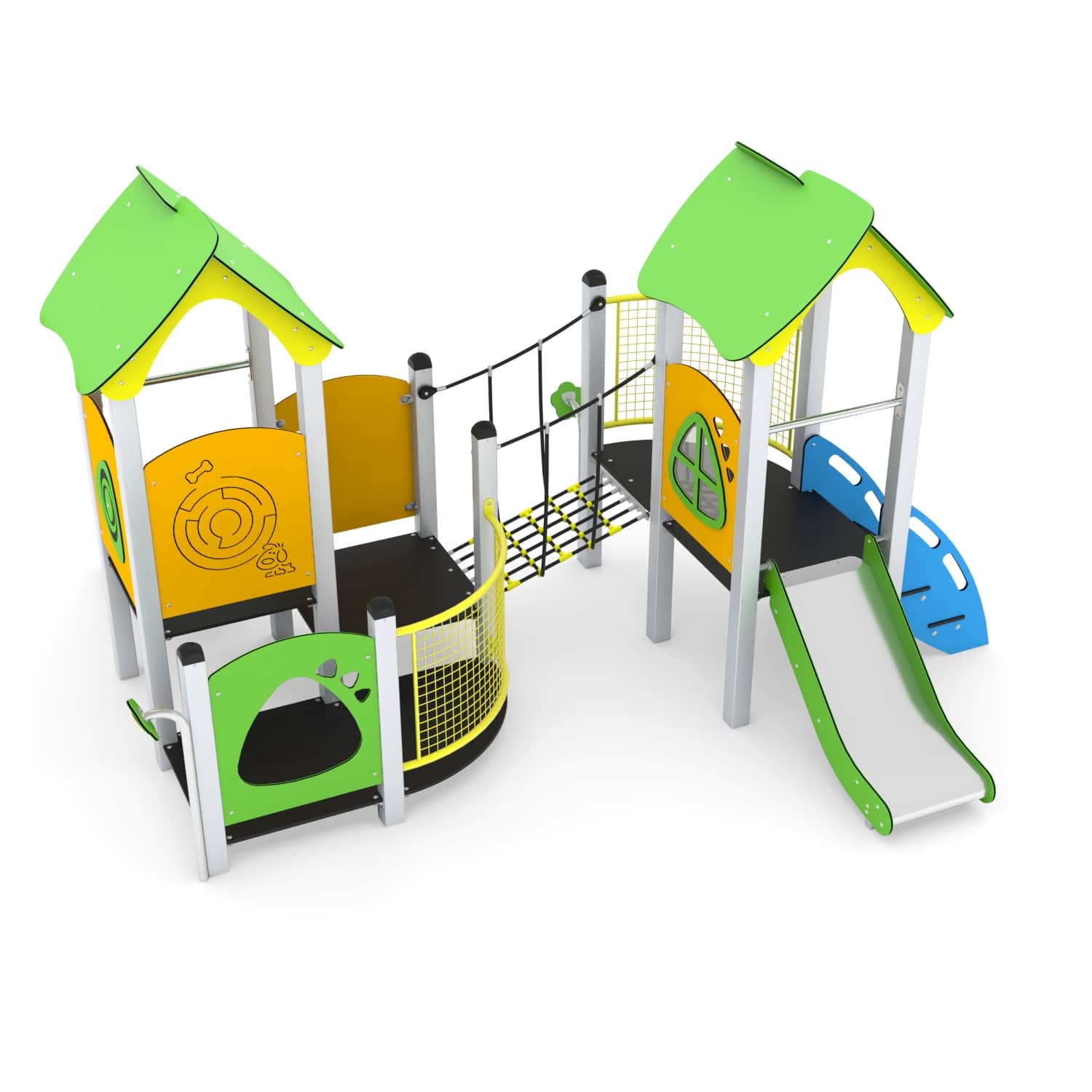 Speelcombinatie met twee torens, 2 glijbanen en netbrug