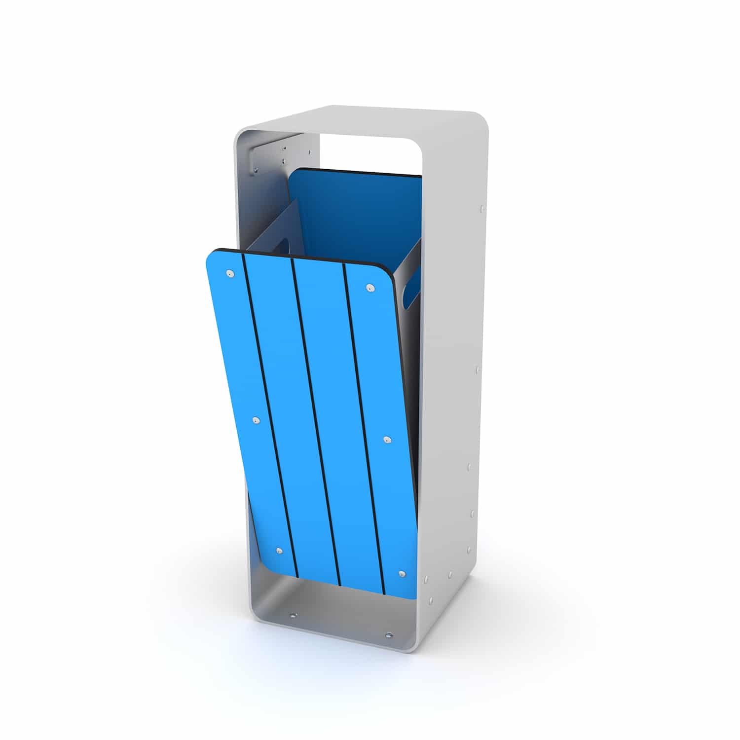 Strak vormgegeven afvalbak vervaardigd uit verzinkt en gepoedercoat staal met HDPE front.