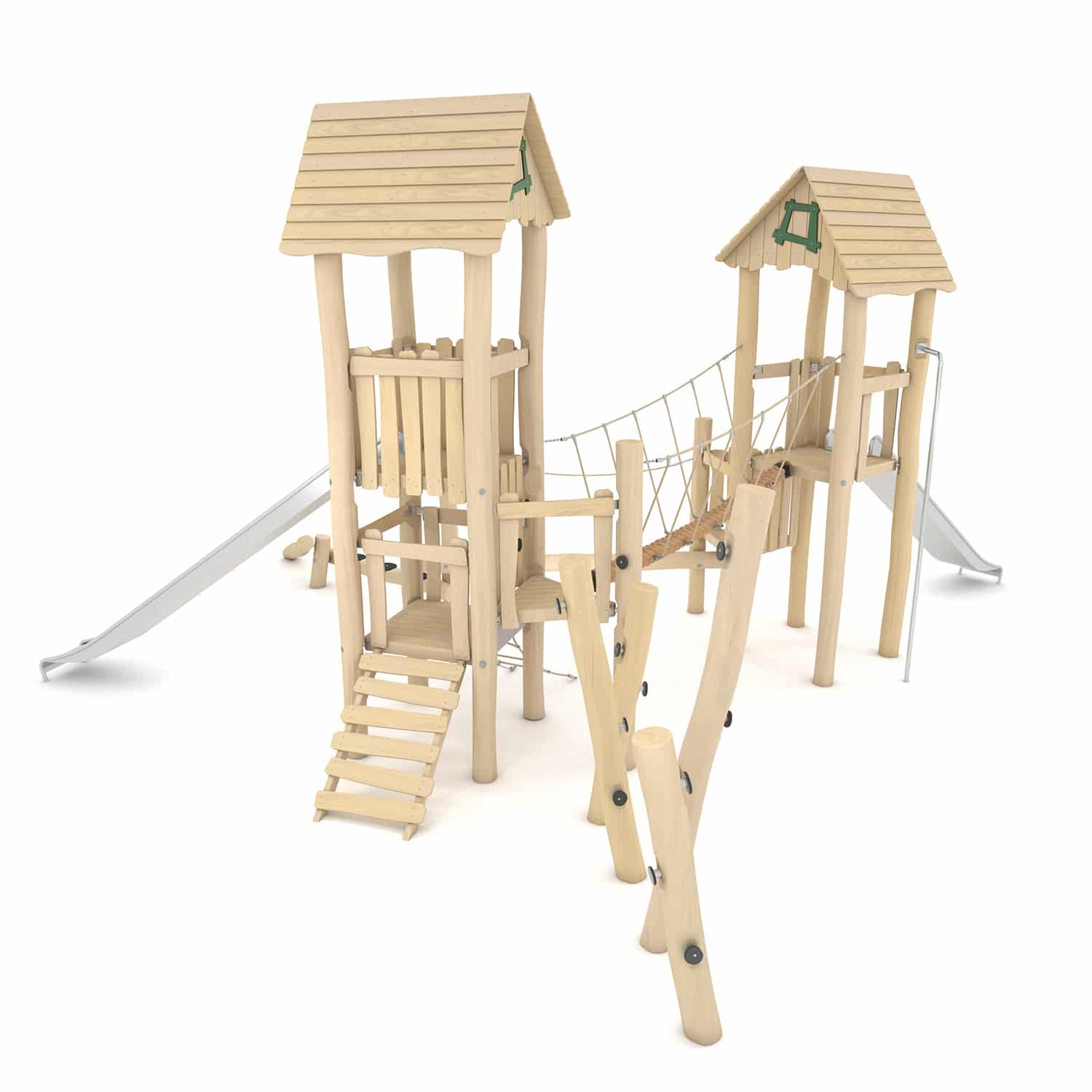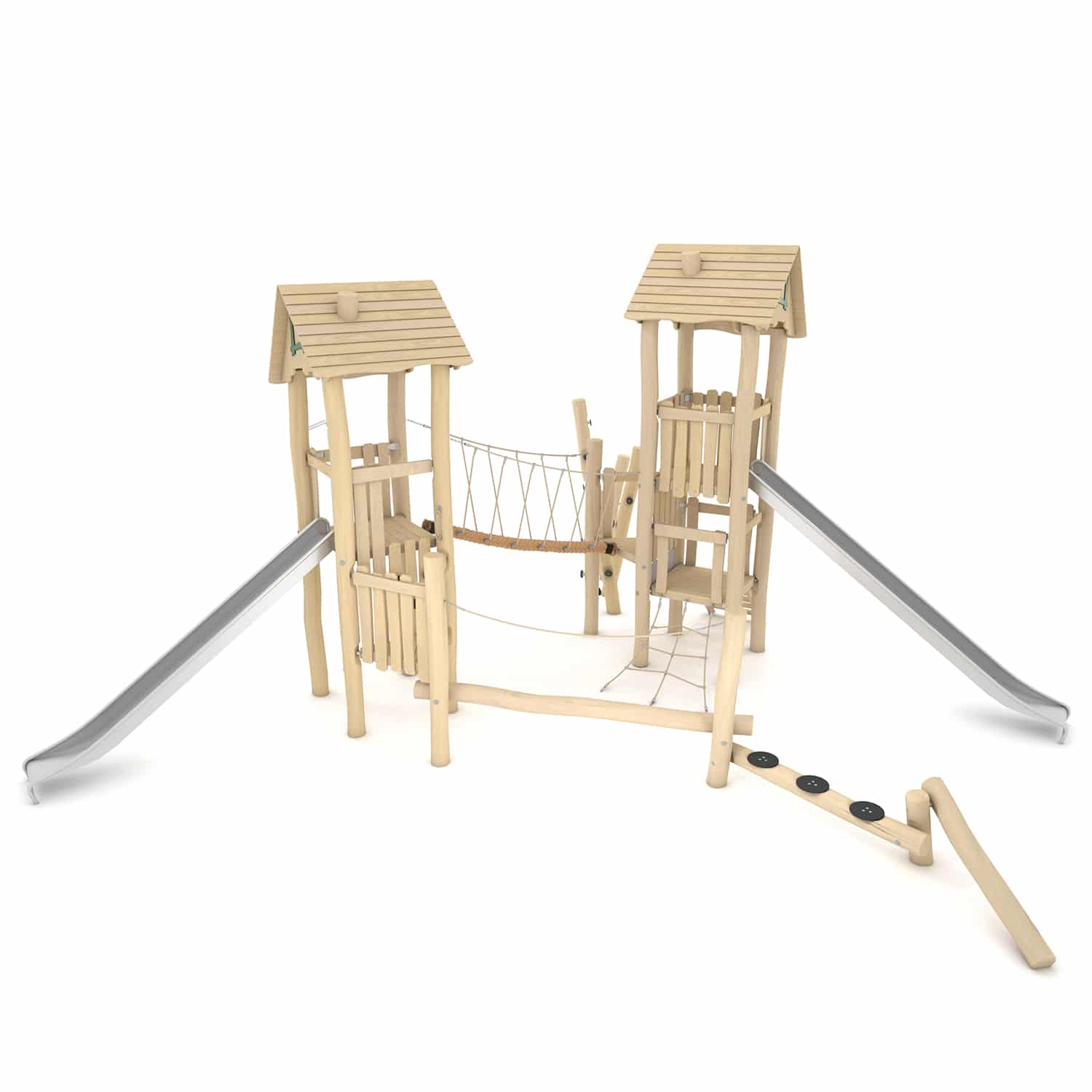 Speelcombinatie met twee torens, touwbrug, twee glijbanen en evenwichtsparcours
