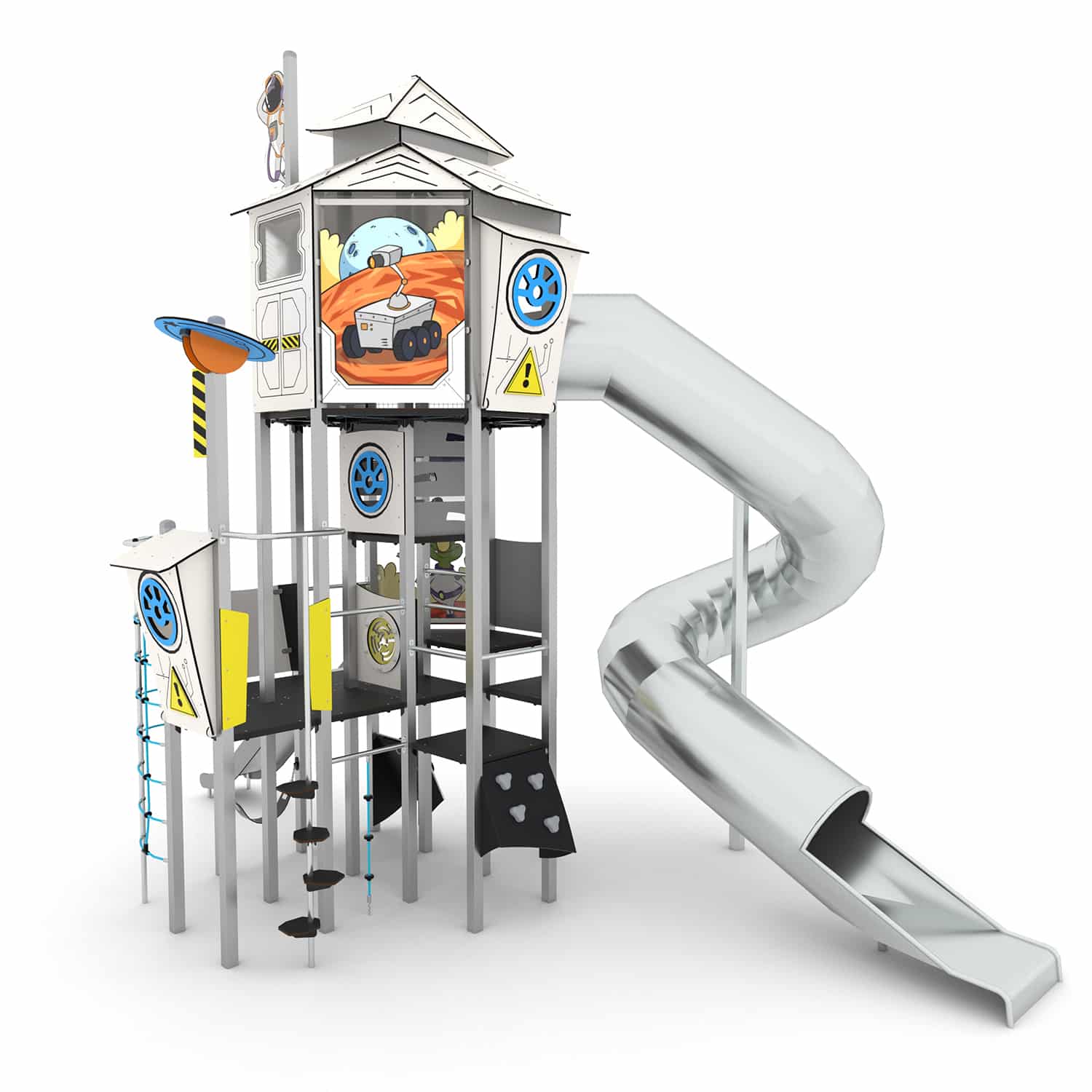 De Space serie bestaat uit een indrukwekkende serie speelcombinaties in ruimtethema. Door de thematisch vormgegeven speeltoestellen kan rollenspel tot ware kunst verheven worden. Daarnaast raak je niet uitgespeeld door de vele manipulatieve elementen die in de producten verwerkt zijn. Binnen de serie is er niet bespaard op kwaliteit. Hoogwaardige verzinkte stalen staanders met coating vormen de stabiele basis, plaatwerk is vervaardigd uit hoogwaardig HDPE en HPL kunststof en bruggen en klimnetten zijn van staalversterkt touwwerk. Met torens tot wel 9.00 meter hoog kan er op verschillende niveaus worden gespeeld en zijn de RVS buisglijbanen een regelrechte hit!