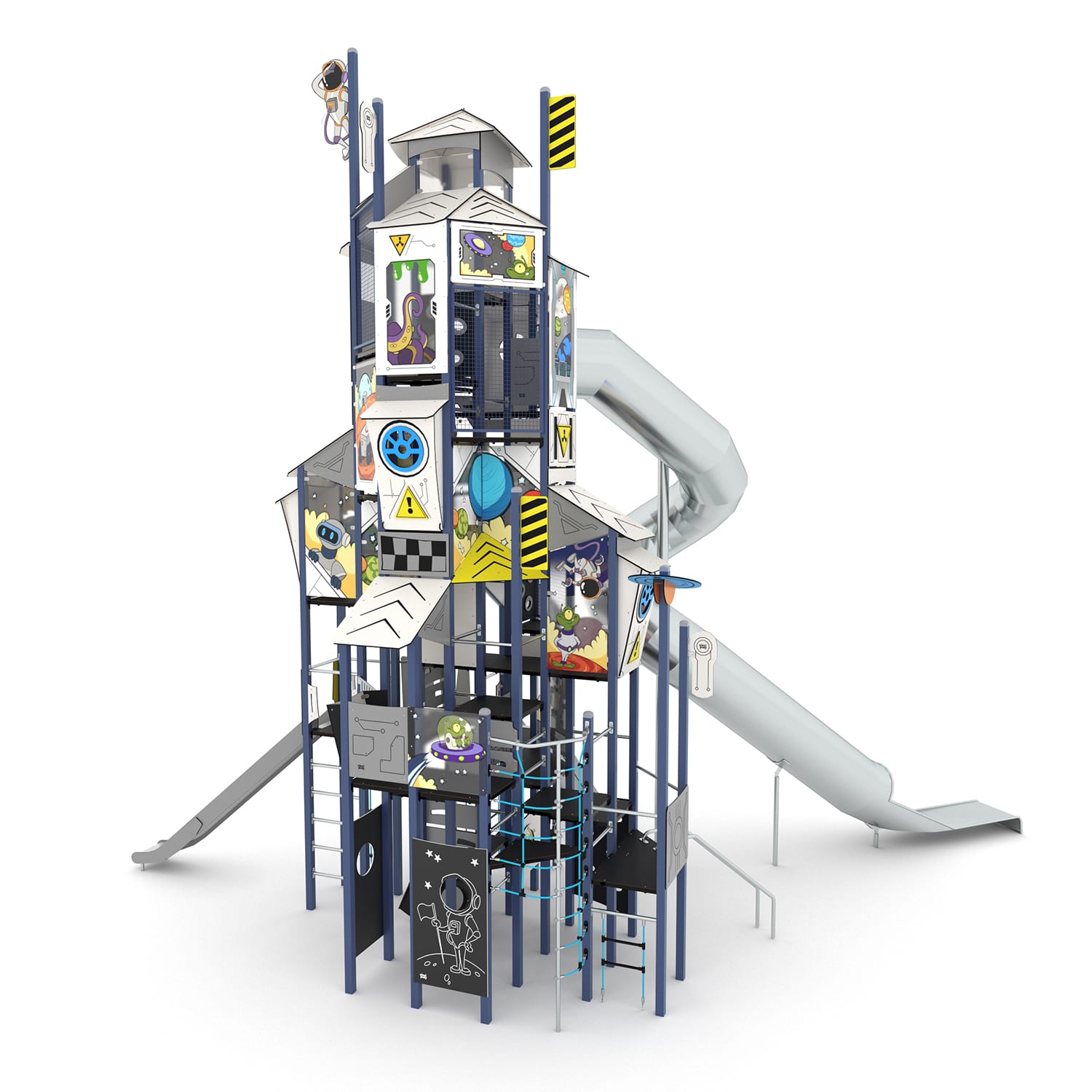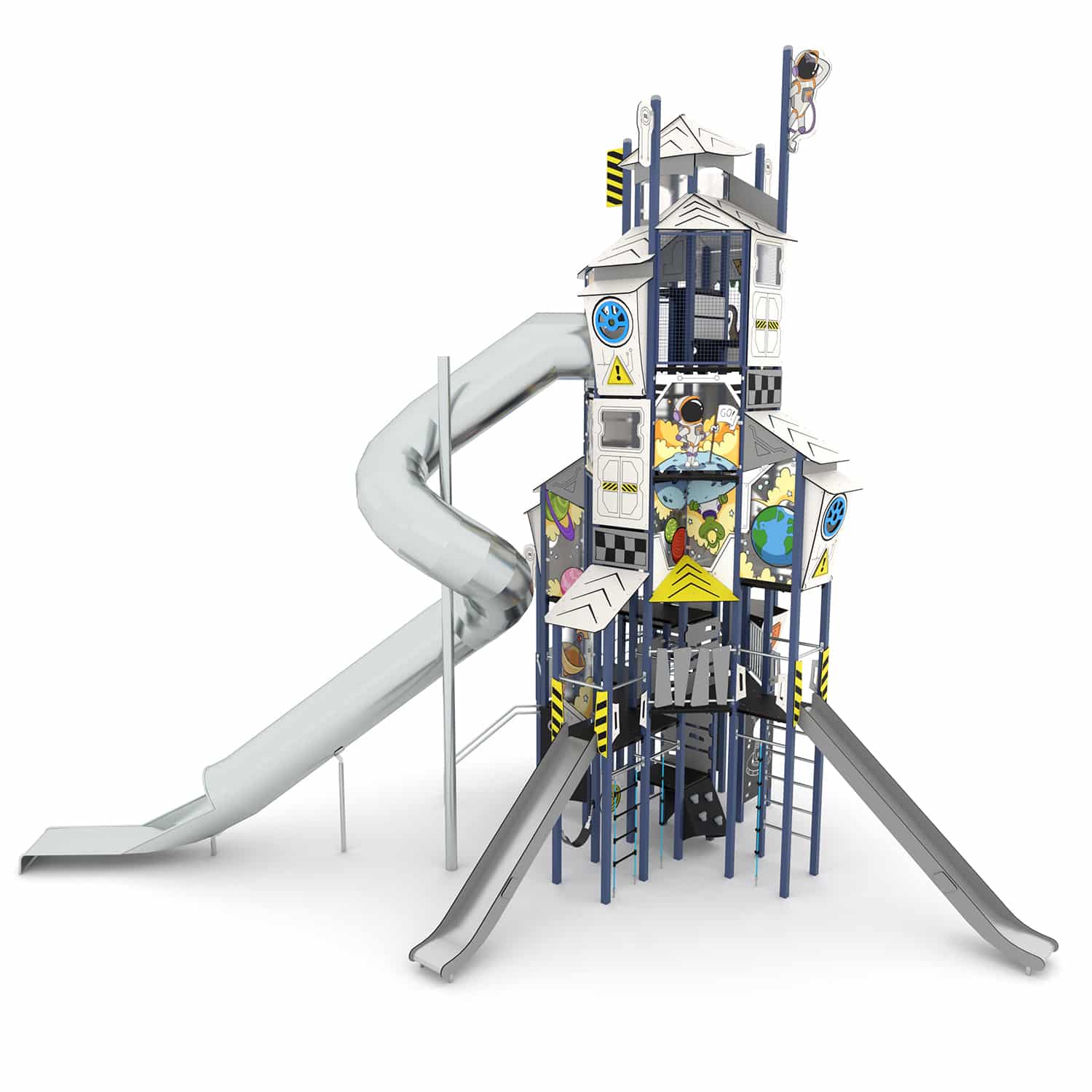 De Space serie bestaat uit een indrukwekkende serie speelcombinaties in ruimtethema. Door de thematisch vormgegeven speeltoestellen kan rollenspel tot ware kunst verheven worden. Daarnaast raak je niet uitgespeeld door de vele manipulatieve elementen die in de producten verwerkt zijn. Binnen de serie is er niet bespaard op kwaliteit. Hoogwaardige verzinkte stalen staanders met coating vormen de stabiele basis, plaatwerk is vervaardigd uit hoogwaardig HDPE en HPL kunststof en bruggen en klimnetten zijn van staalversterkt touwwerk. Met torens tot wel 9.00 meter hoog kan er op verschillende niveaus worden gespeeld en zijn de RVS buisglijbanen een regelrechte hit!