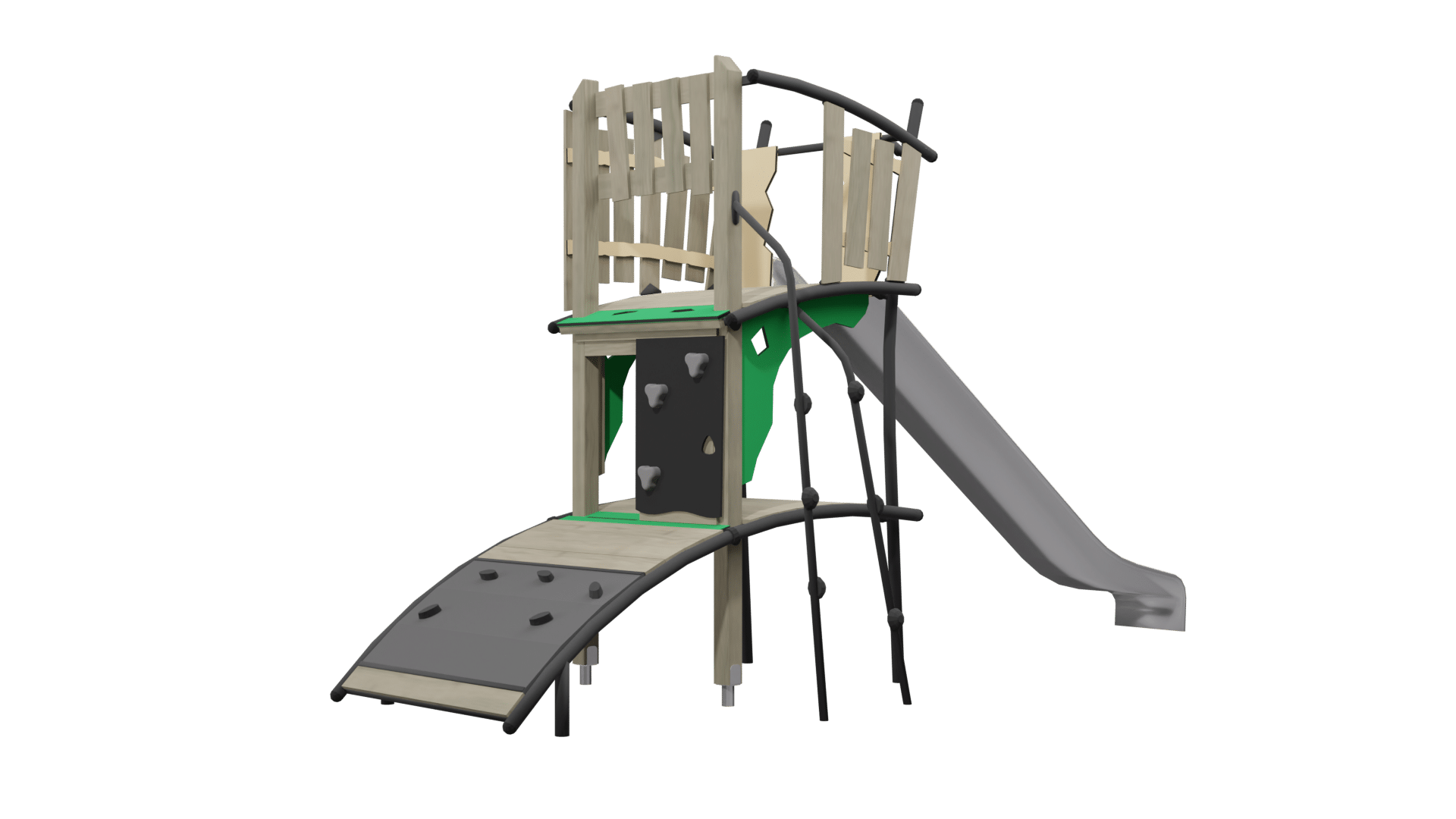 Dit moderne speeltoestel combineert klimmen, klauteren en glijden in één compacte en dynamische constructie. Het toestel bestaat uit een verhoogd platform, veilig omsloten met houten panelen, dat kinderen een gevoel van hoogte en avontuur geeft. Vanaf het platform glijden ze soepel naar beneden via een stevige RVS-glijbaan, die garant staat voor snelheid én duurzaamheid.