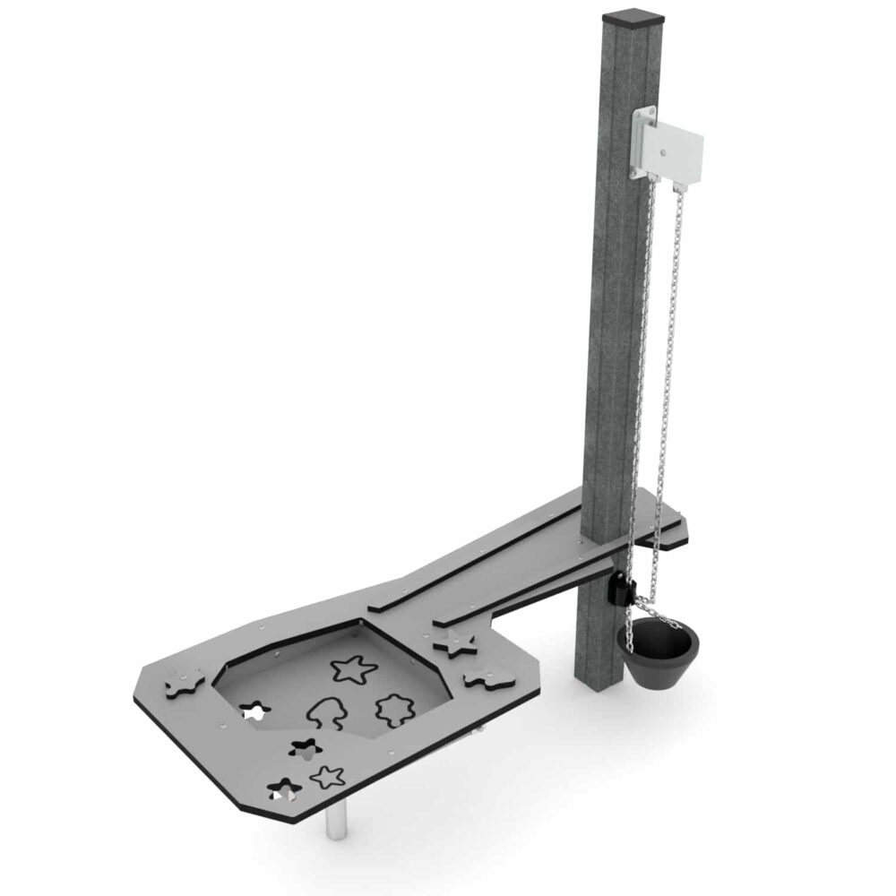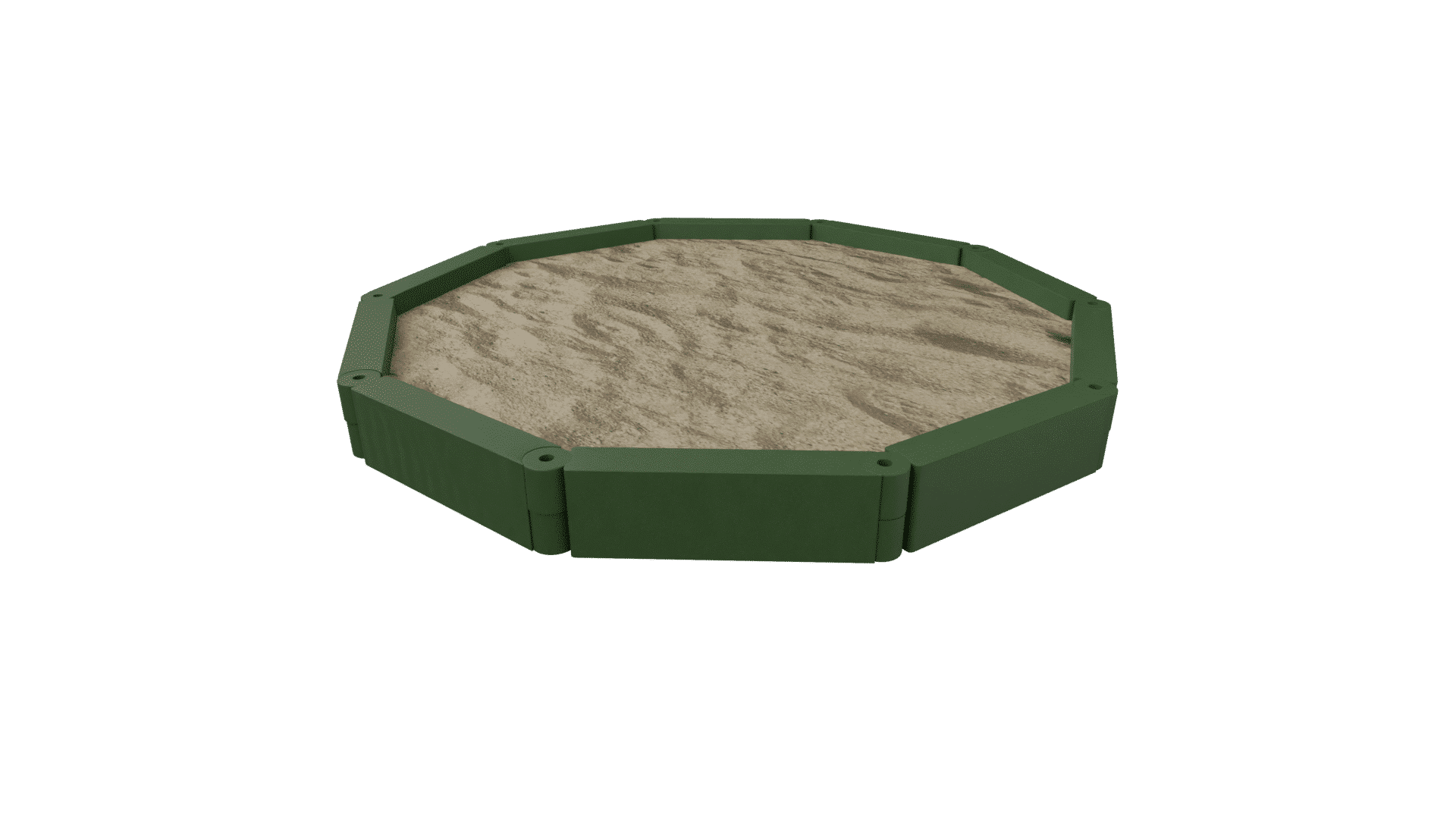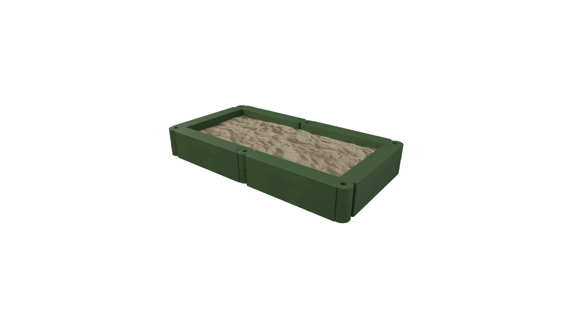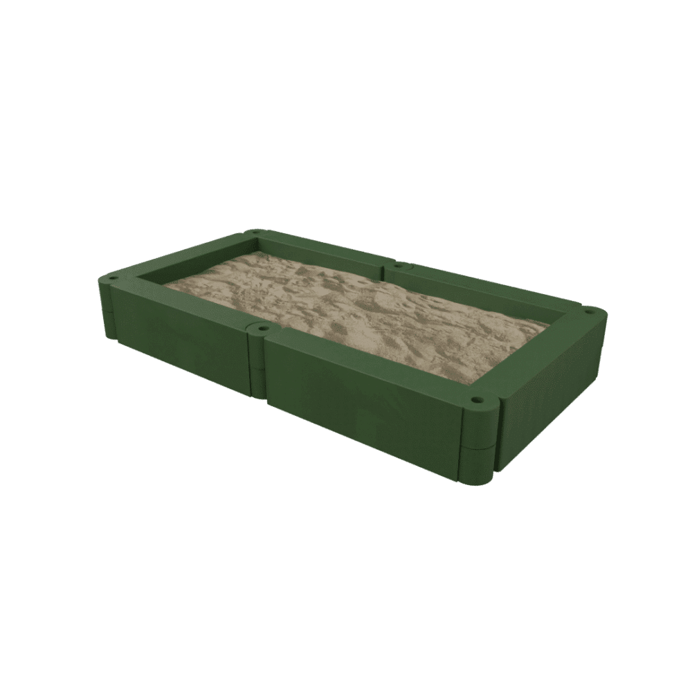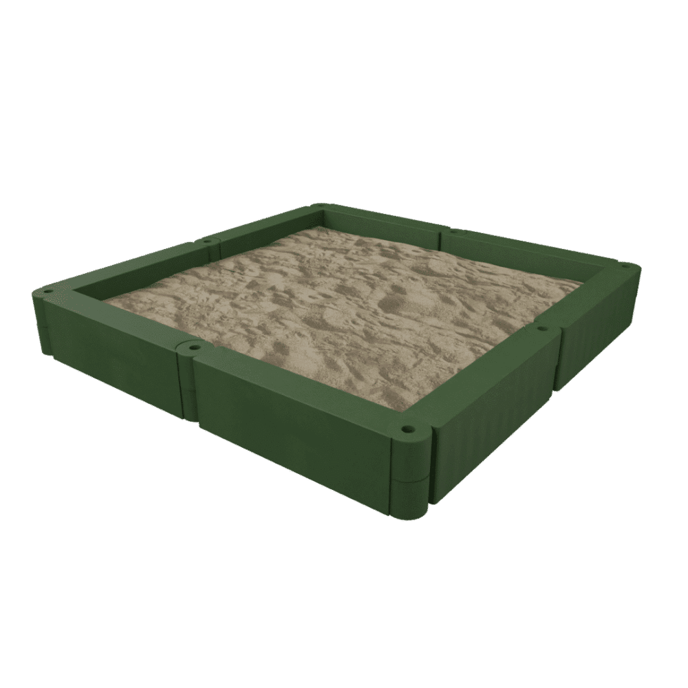 Deze zandbak kan eenvoudig op bestaande bestrating worden aangebracht of kan er – voor een diepere zandbak – de bestrating binnen de zandbak verdiept worden aangebracht. Op de hoeken zijn kunststof zitjes aangebracht waar ook een taartje op gebakken kan worden.