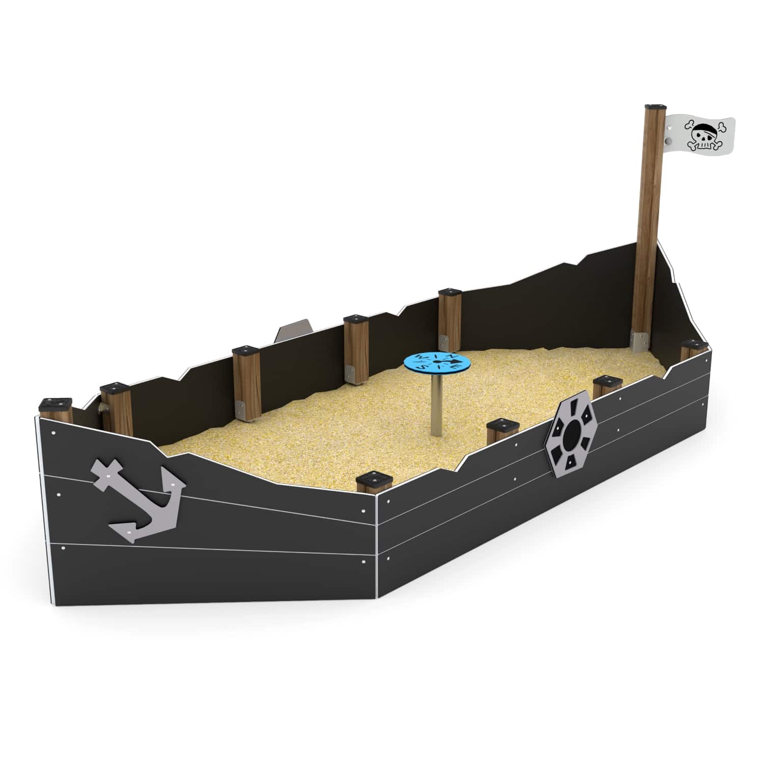 Deze zandbak spreekt tot de verbeelding! Een Zandschip uitgevoerd met tafel om de rantsoenen zoals een zandtaartje op voor te bereiden. Als vlag kan ook voor een andere afbeelding worden gekozen.