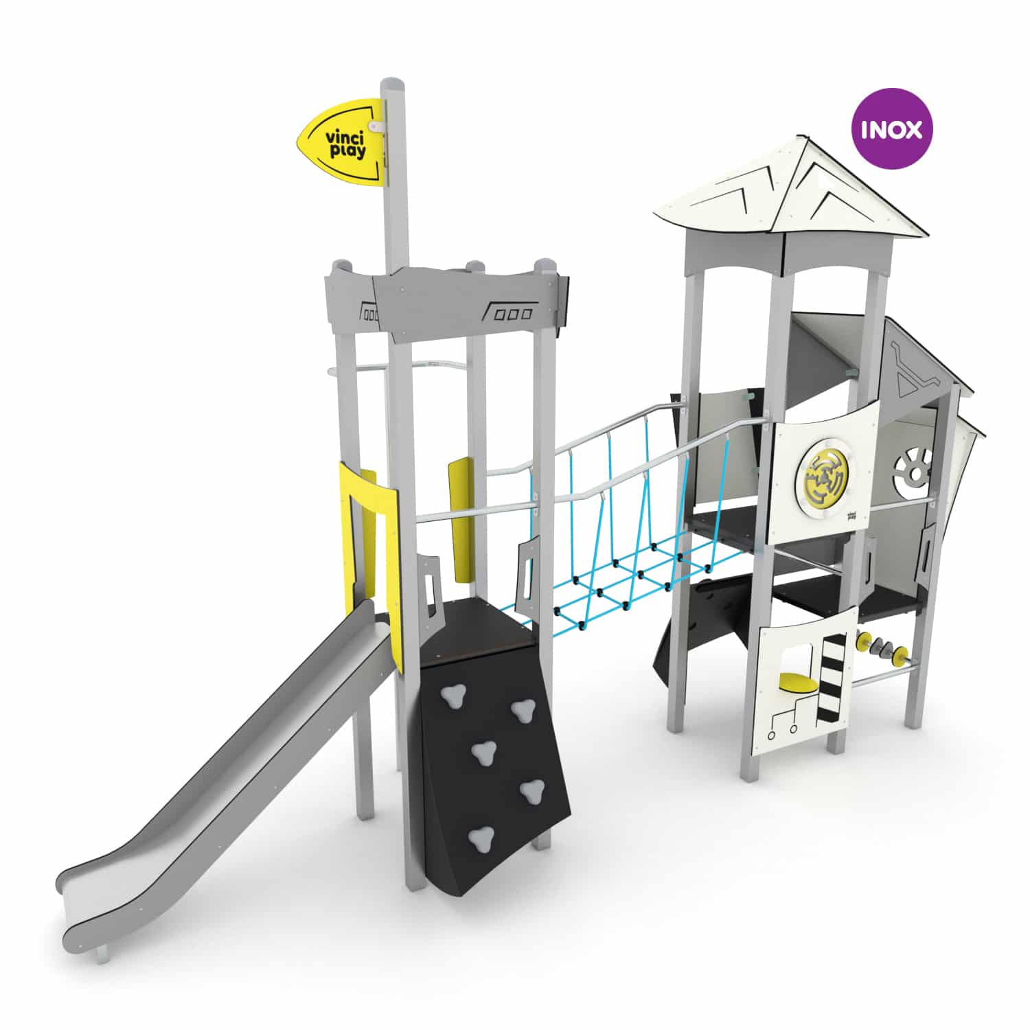 De Space serie bestaat uit een indrukwekkende serie speelcombinaties in ruimtethema. Door de thematisch vormgegeven speeltoestellen kan rollenspel tot ware kunst verheven worden. Daarnaast raak je niet uitgespeeld door de vele manipulatieve elementen die in de producten verwerkt zijn. Binnen de serie is er niet bespaard op kwaliteit. Hoogwaardige verzinkte stalen staanders met coating vormen de stabiele basis, plaatwerk is vervaardigd uit hoogwaardig HDPE en HPL kunststof en bruggen en klimnetten zijn van staal versterkt touwwerk. Met torens tot wel 9.00 meter hoog kan er op verschillende niveaus worden gespeeld en zijn de RVS buisglijbanen een regelrechte hit!