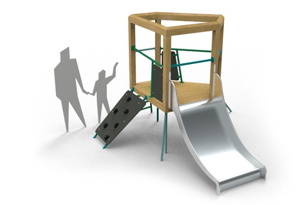 Glijtoren met klimelementen en rvs glijbaan van 0.95 meter hoog.