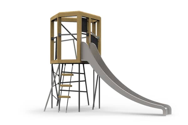 Abstracte glijtoren met verschillende klimopgangen en een glijbaanhoogte van 1.50 meter.