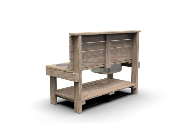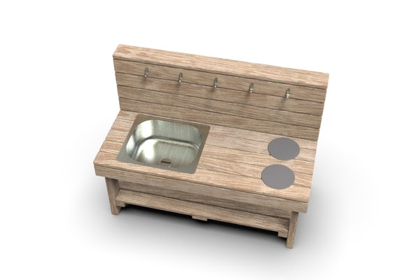 Speelkeuken met haakjes, kookplaat en wasbak.