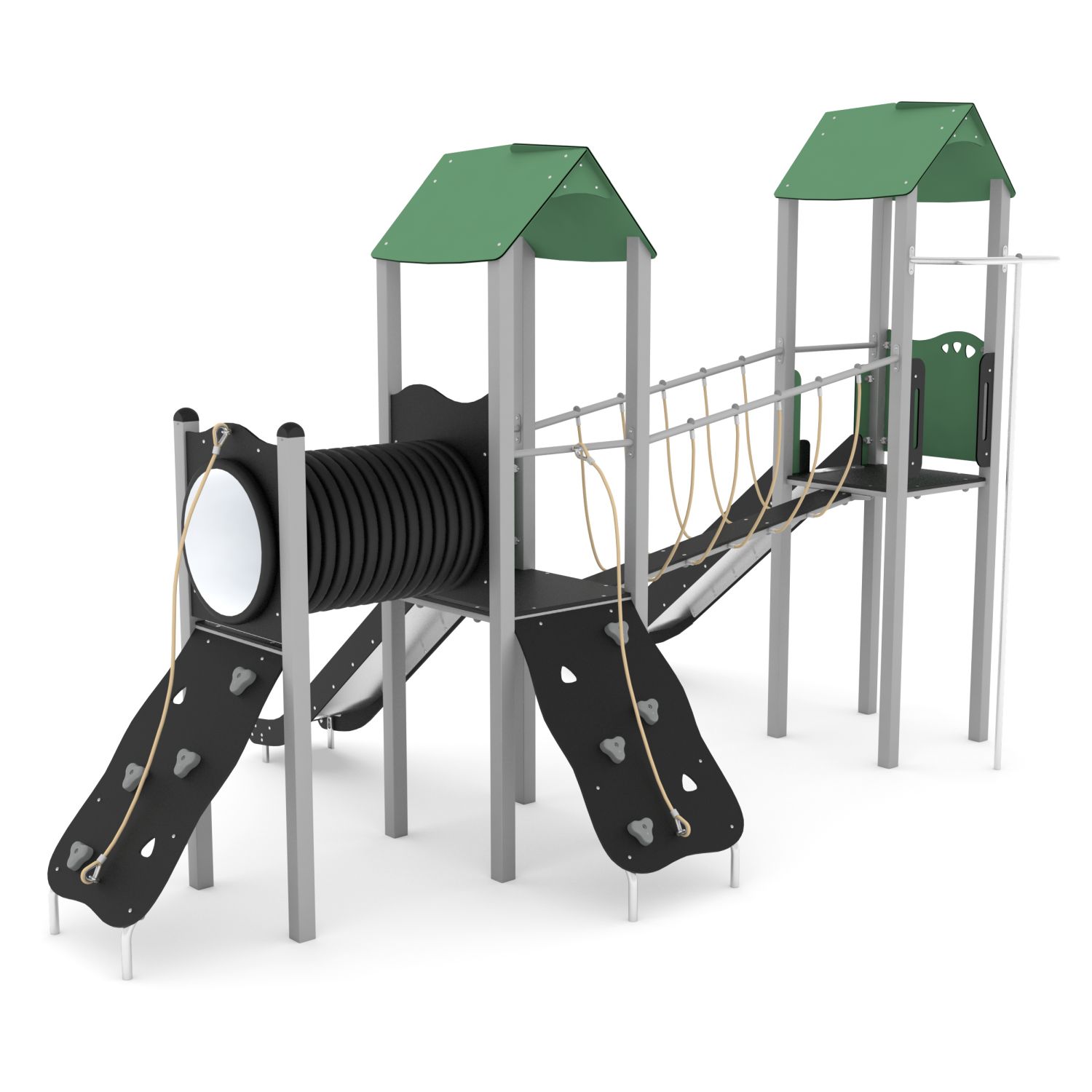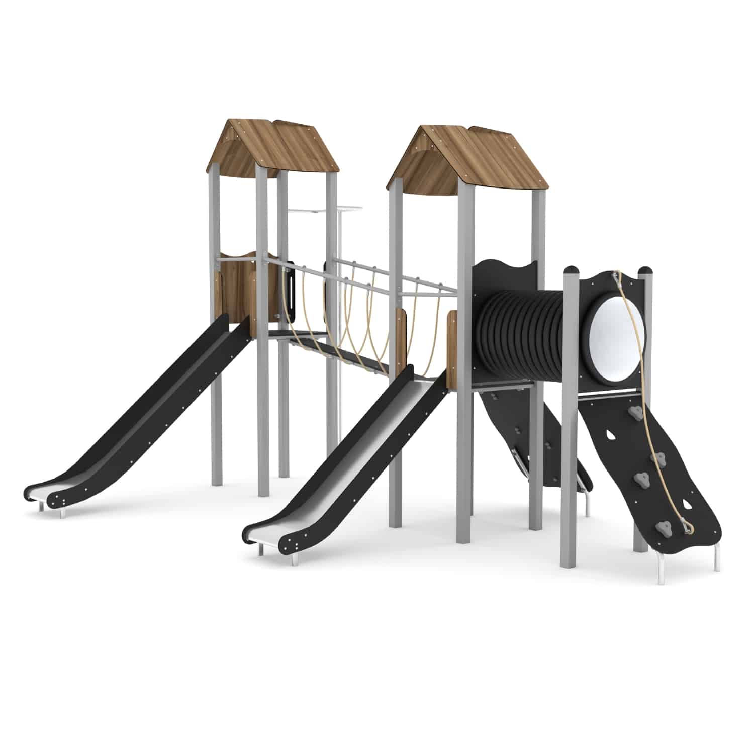 Speelcombinatie met 2 torens met glijbaan, balanceerbrug, kruipbuis en brandweerpaal